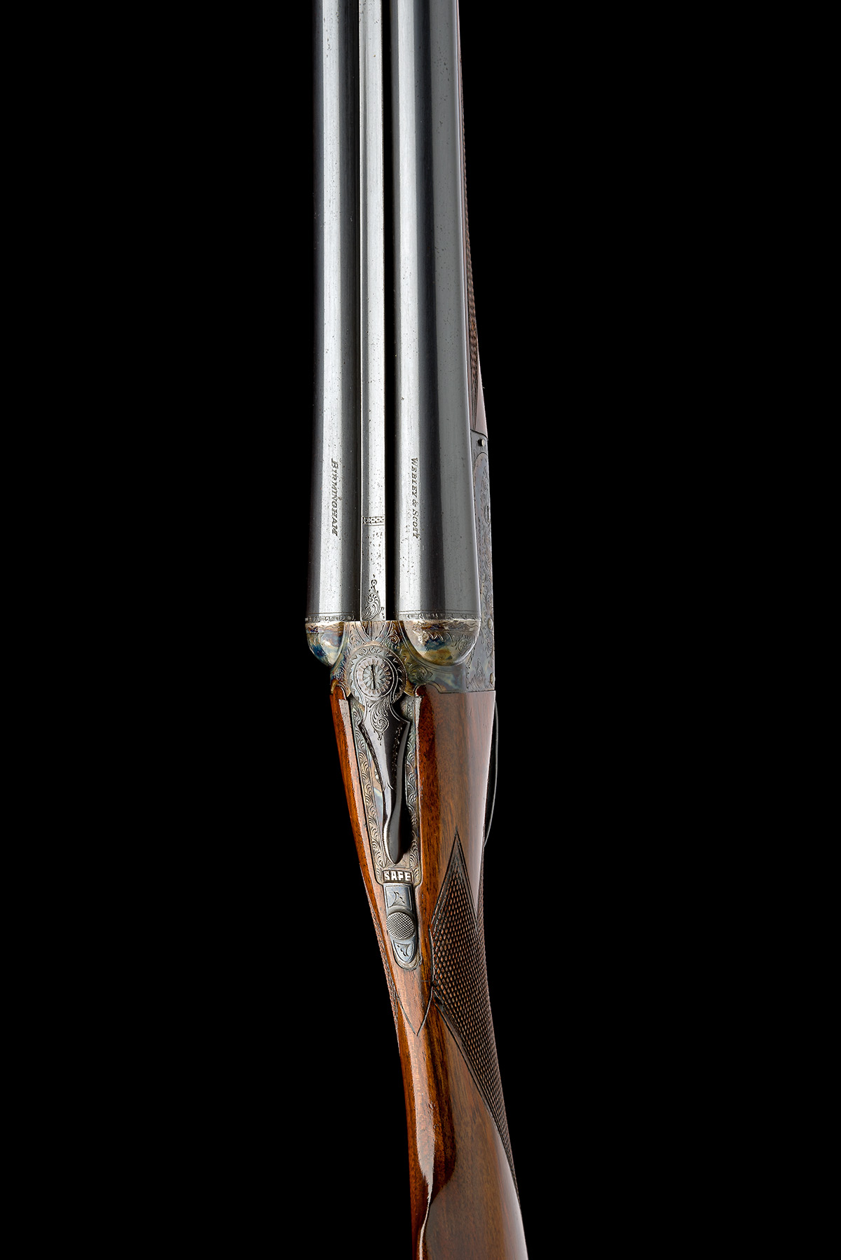 dated 1963, 28in. nitro barrels, tubes engraved 'WEBLEY & SCOTT. BIRMINGHAM.', 2 3/4in. chambers, bored approx. 1/4 and 3/4 choke, automatic safety, border and acanthus scroll engraving, retaining virtually full original colour-hardening and finish, 14 1/4in. stock including 1in. ventilated rubber recoil pad, weight 6lb. 9oz.
