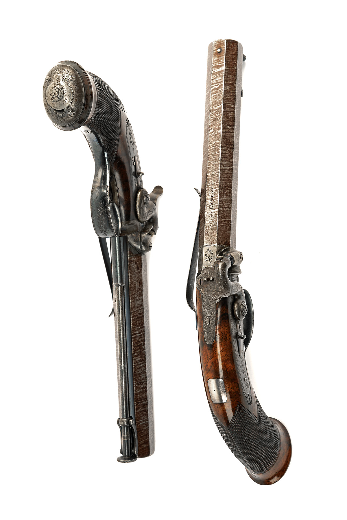 circa 1840, with brown laminated octagonal 6in. barrels signed on the top-flats 'LONDON', border and scroll engraved colour hardened breech-blocks, bead fore-sights, fully engraved top-tangs with standing notch rear-sights, moulded nipple bosses with screwed plugs, border and scroll engraved diminutive curved back-action colour hardened locks signed 'MANTON & SON' and fitted with engraved dolphin-headed hammers with rear-mounted bolted safes, chequered walnut grips swelling at the pommel and fitted with engraved domed butt-caps with central traps, guarded triggers, London proofs and captive iron swivel ramrods below the barrel, the left side of each pistol with a sideplate mimicking the lockplate and fitted with a blued spring-steel belt-hook, strong amount of original finish to both pistols and complete with their oak storage case lined and compartmented in green baize and including a three-way flask, a further bag-shaped flask, a turn-screw, loading rod, spring cramp and a possibly later nipple or cap-pot, the inside of lid with John Manton & Son parchment trade-label