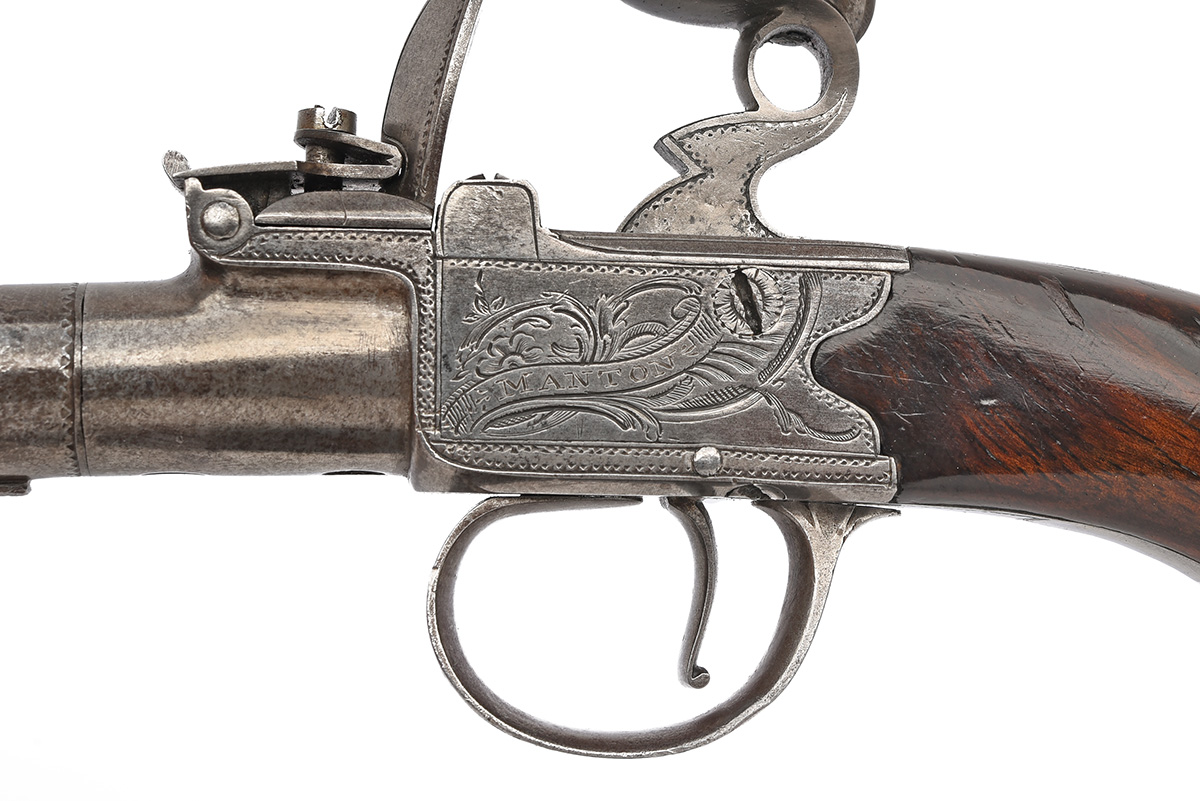 hallmarked for Birmingham 1782, with tapering iron turn-off 2 1/2in. banded barrels, rounded London proved breeches, border and scroll engraved boxlock actions signed 'MANTON' on the left and 'LONDON' on the right, central ring-necked cocks, smooth walnut grips with hallmarked silver grotesque mask butt-caps and sliding trigger-guard safes