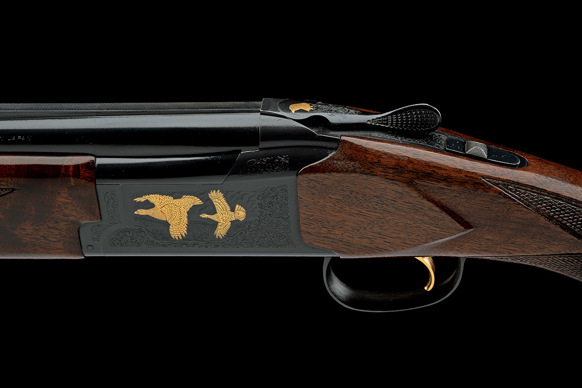 for 2017, 30in. high performance steel proof nitro barrels with 6mm ventilated matt top rib, 3in. chambers, multichokes (with spares), hold-open toplever with gold-inlaid partridge, manual safety with integral barrel-selector switch, gold-washed trigger, blacked action with gold-highlighted scenes of partridge and pheasant in flight surrounded by acanthus scrollwork, 14 1/2in. figured semi-pistolgrip stock including 3/4in. rubber recoil pad, weight 7lb. 8oz., in its makers universal ABS case with paperwork and some accessories
