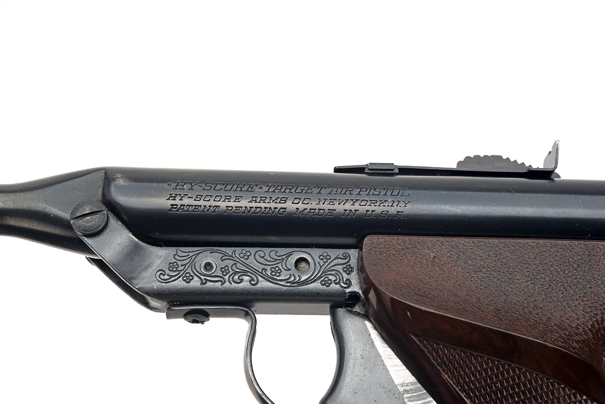 A .22 HY-SCORE MOD 800 AIR-PISTOL, serial no. 923218, in a later box, circa 1975, with 10 1/4in. concealed barrel, blued finish with scroll engraved detail to frame and mottled brown bakelite grip, appearing little used, in a later dedicated card carton