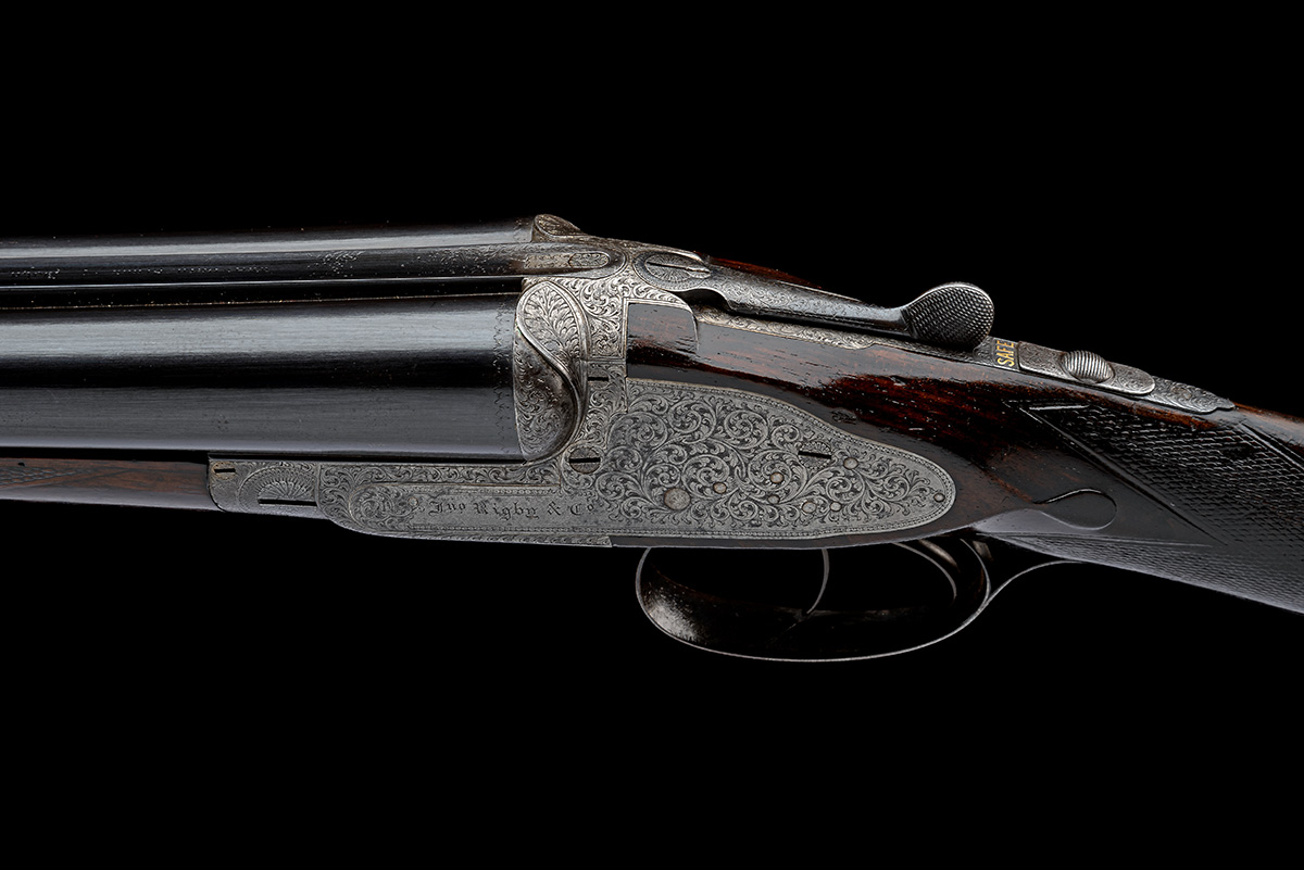 for 1894, 30in. nitro reproved barrels (in 1963), the rib engraved 'JOHN RIGBY & CO. 73 ST. JAMES'S STREET. LONDON. AND AT DUBLIN.', (faint) in gothic script, and 'WHITWORTH STEEL', 2 1/2in. chambers, bored approx. imp. cyl. and 1/4 choke, treble-grip action incorporating J. Rigby and T. Bissell patent rising third bite, patent No. 1141 of 1879, use number 577, action number 2333, carved leaf fences, slender toplever, automatic safety with gold-inlaid 'SAFE' detail, dipped-edge lockplates, best bold and acanthus scroll engraving, 13 1/2in. figured stock, fore-end with grip-catch release lever engraved 'RIGBY'S PATENT.', weight 6lb. 6oz., in its lightweight leather guncase