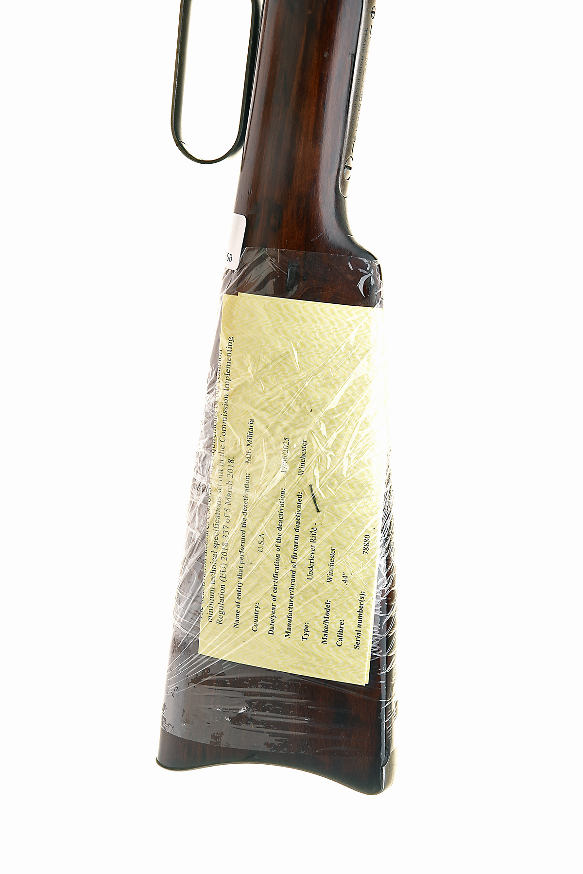 A DEACTIVATED WINCHESTER .44-40 W.C.F. 'MODEL 1892' LEVER-ACTION SADDLE-RING CARBINE, serial no. 788807, for 1915, 19 3/4in. barrel, adjustable open rear sight, block and blade fore-sight, full-length tubular magazine, blued receiver with saddle ring, 13in. pull including steel buttplate, together with its EU deactivation certificate