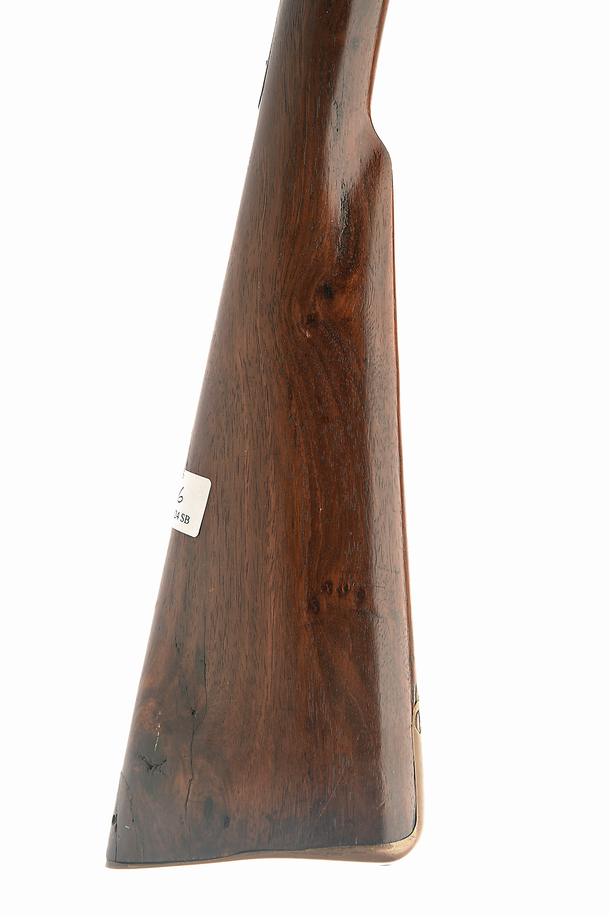 A .700 PERCUSSION INDIAN CARBINE, serial no. JPR/EXR/1517, cut back from an East India musket circa 1850, with 19in. barrel, fixed sights, plain lock of flint form, walnut full-stock with brass furniture and iron ramrod (originally swivel mounted, now loose)