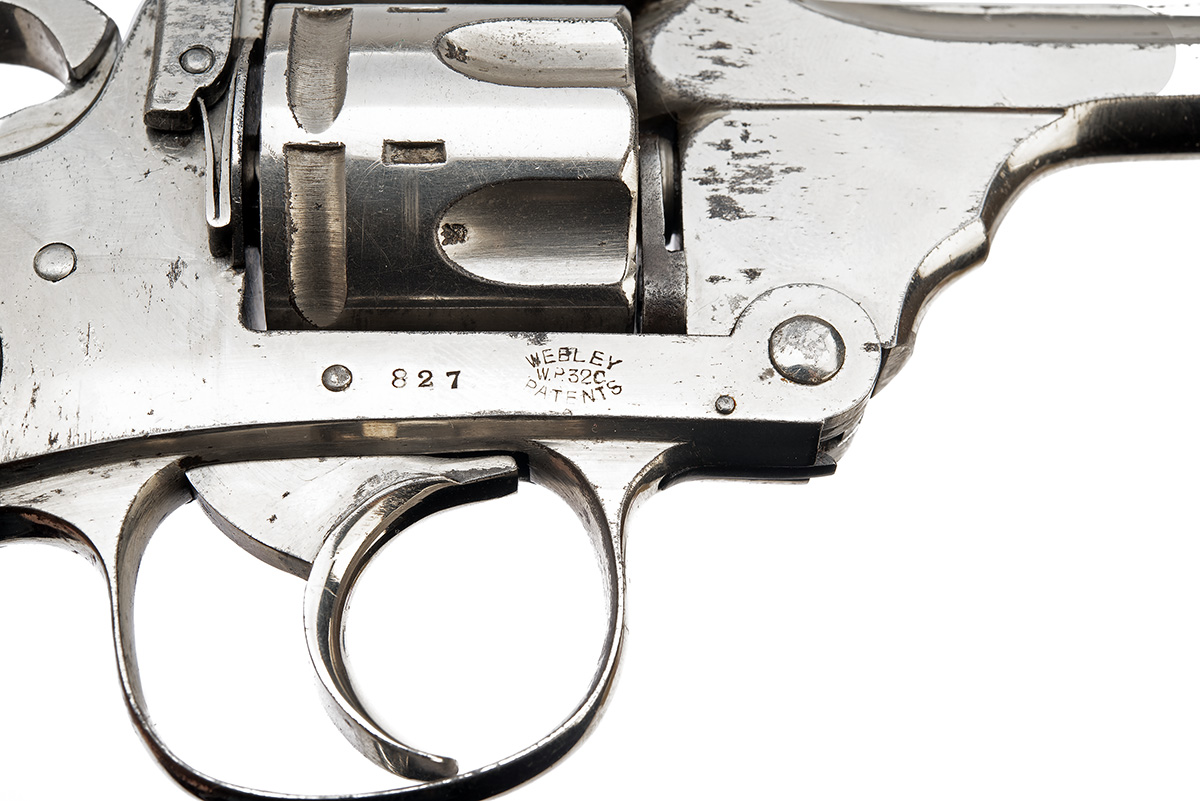 circa 1900, with 3in. nickel-plated sighted barrel marked on the left side with a later South African registration number 'T8849', barrel locking latch chequered to the upper face, fluted cylinder, break-open frame marked 'WEBLEY PATENTS W.P. 320' on the right hand side, rocking frame mounted cylinder release locking-catch, double action mechanism with exposed hammer, chequered hard-rubber grips and retaining the majority of its original plated finish throughout
