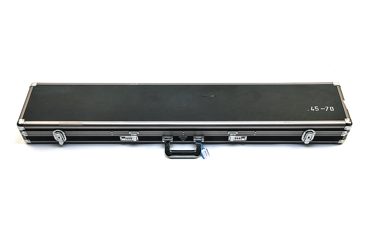AN UNSIGNED FULL-LENGTH ALUMINIUM GUNCASE, foam-lined interior, measuring approx. 48in. x 8 1/2in., two clasp and two combination locks