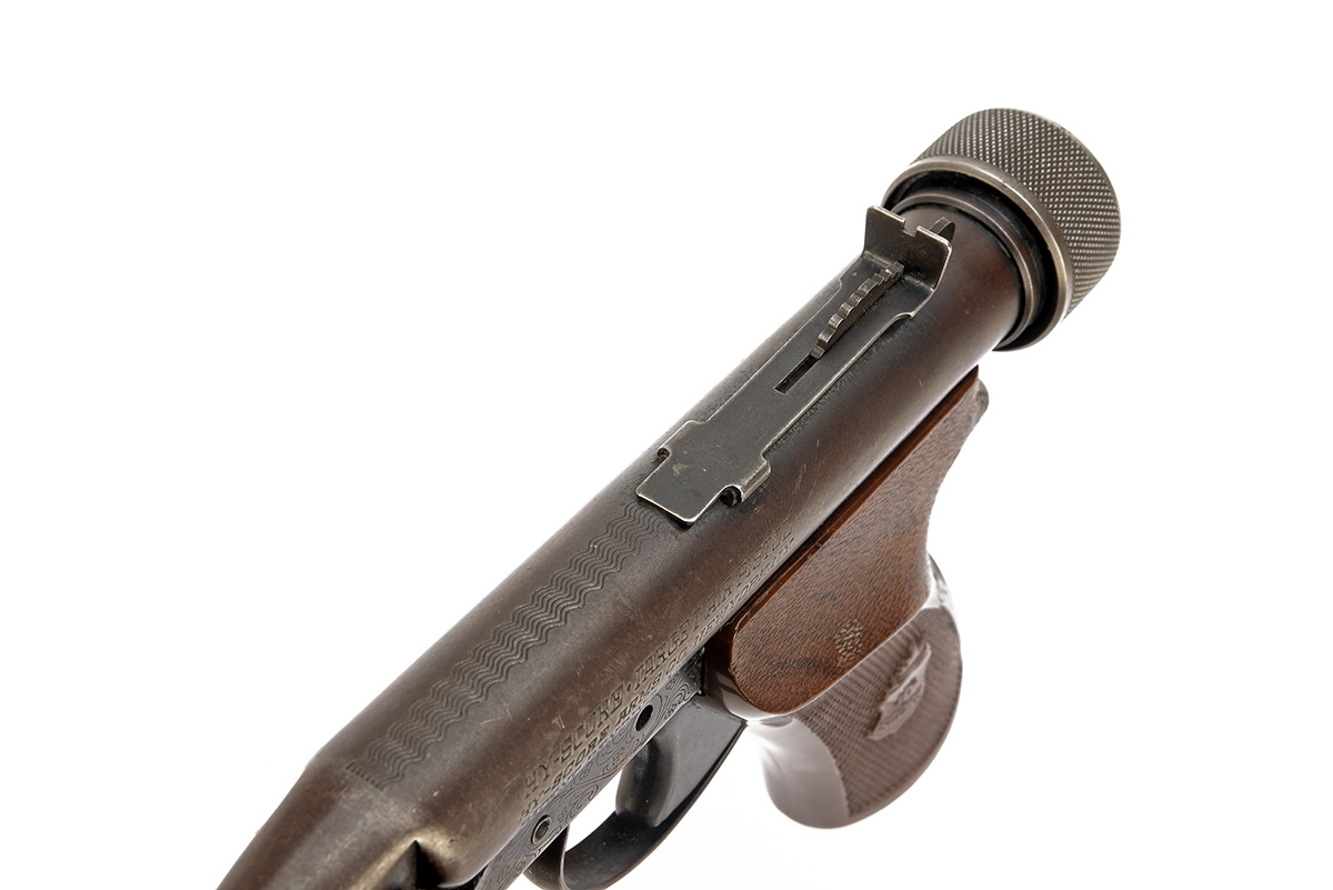 A .22 HY-SCORE CONCENTRIC-PISTON AIR-PISTOL, serial no. 889361, circa 1968, with internally mounted 10in. barrel, blade fore-sight and buckhorn rear-sight, iris aperture for loading at rear, partially scroll engraved frame and chequered red-brown mottled hard plastic grip, finish faded