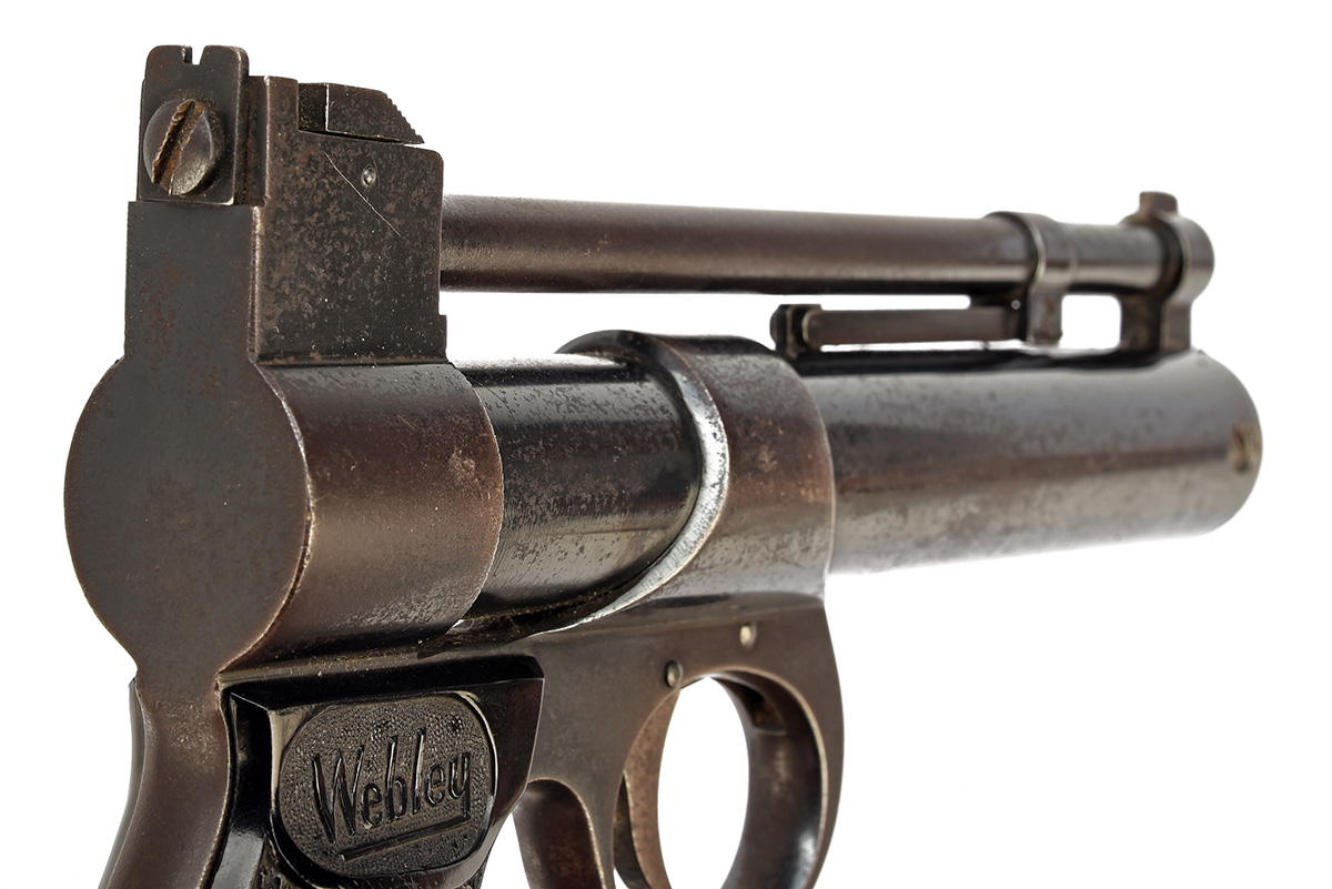 A .177 WEBLEY & SCOTT JUNIOR AIR-PISTOL, batch no. 944, with blued 6in. barrel, adjustable rear-sight, blued air-chamber and chequered hard rubber grips, much original finish remaining