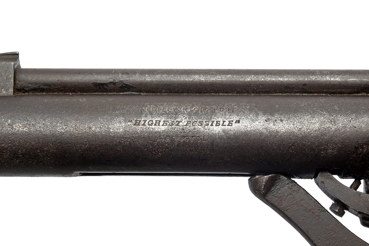 late second series circa 1926, with 9 1/2in. rifled barrel, moulded fore-sight, crescentic adjustable notch rear-sight, chequered hard-rubber grips, air cylinder stamped 'WESTLEY RICHARDS "HIGHEST POSSIBLE" AIR PISTOL' on three lines, frame with maker, patent number and date, guarded trigger blade, the whole retaining traces of original finish in sheltered areas but extensive fine shallow pitting elsewhere
