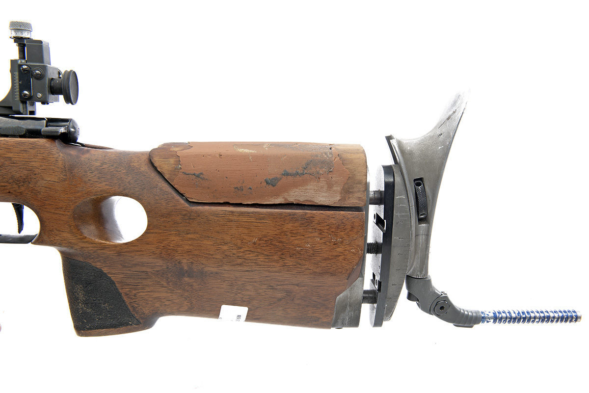 for 1969, 26in. nitro barrel, tunnel fore-sight (detached), rear Anschutz aperture sight, manual safety (not functioning), adjustable trigger, thumbhole adjustable stock with adjustable aluminium hook butt