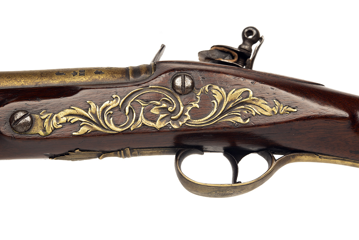 circa 1770, with flaring 12in. barrel with a scroll engraved flourish and moulded band at breech, London proofs and makers stamp 'H.B', radiused straight lock with moulded borderline and scroll engraving to the pointed tail, unbridled frizzen and signed below the shallow pan 'BRUETON', engraved swan-necked cock (fracture forming), walnut handrail banana full-stock with brass furniture, carved apron and rococo escutcheon at wrist, pierced and moulded floral sideplate and working replacement worm-tipped ramrod
