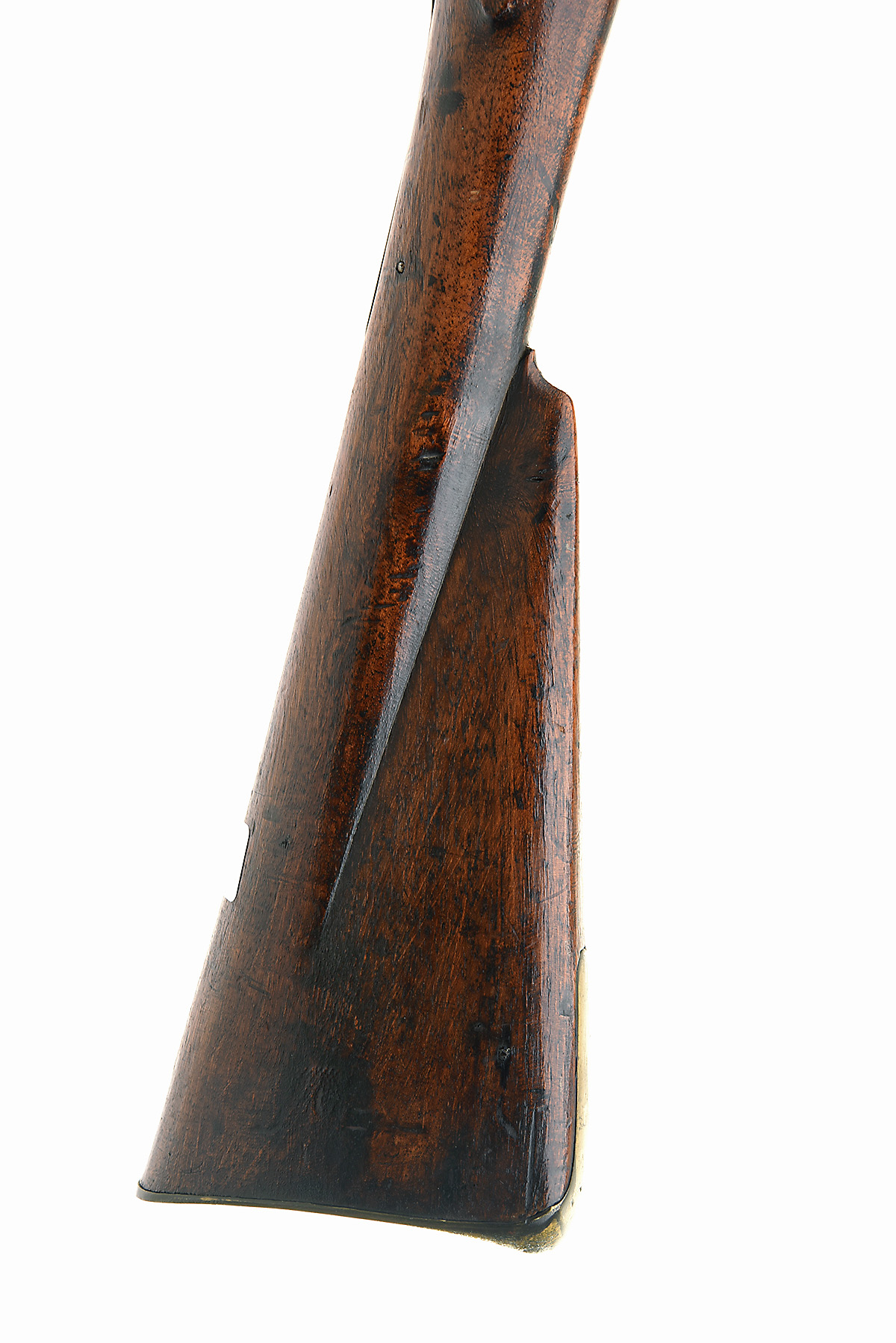 A .750 FLINTLOCK 'BROWN BESS' MUSKET, UNSIGNED, no visible serial number, circa 1795, of India pattern with 39 1/2in. barrel, private proofs, 'G.R.' and crown device to the lock, swan necked cock, walnut full-stock with handrail grip and angled comb, brass furniture and iron ramrod, shallow pitting externally to barrel