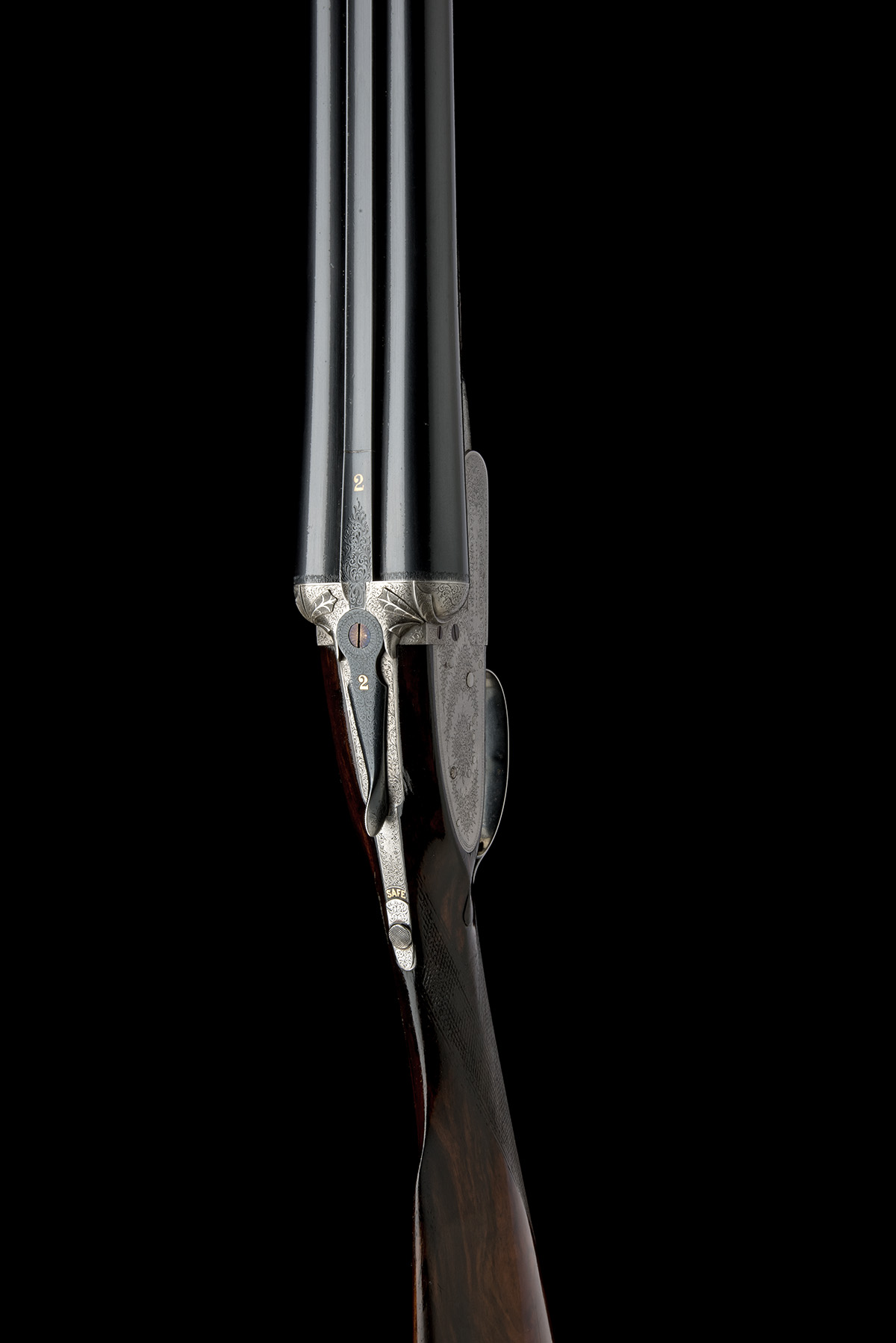 circa 1897, 28in. replacement nitro barrels (in 1978), 2 1/2in. chambers, bored approx. imp. cyl. and 1/2 choke, treble-grip action with carved stylised acanthus fences, toplever gold-inlaid '2', automatic safety with gold-inlaid 'SAFE' detail, beaded border and acanthus scroll engraving, 14 3/4in. figured stock including buttplate, weight 6lb. 12oz., in a leather case