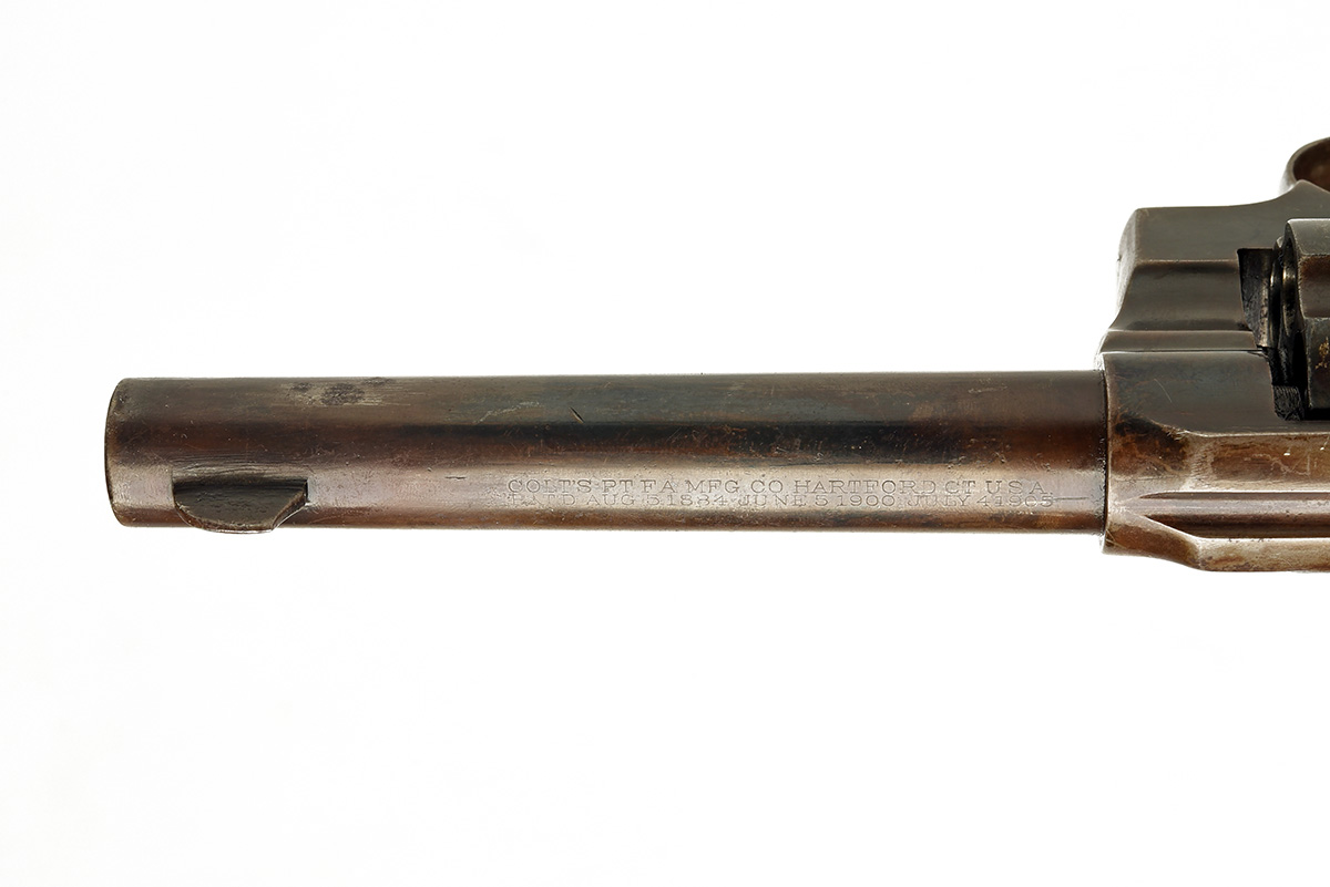 A .455 COLT NEW SERVICE REVOLVER, serial no. 107412, for 1916, with 5 1/2in. barrel, solid frame with swing-out fluted cylinder, chequered hard rubber grips (both chipped at heel), the whole an older refinish