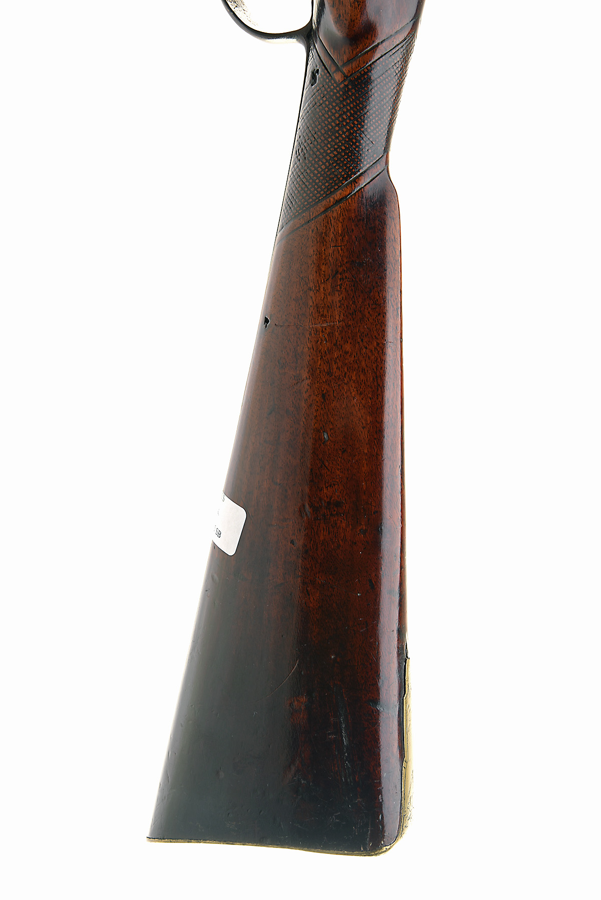 A 16-BORE PERCUSSION SINGLE-BARRELLED SPORTING-GUN POSSIBLY SIGNED HARCOURT, no visible serial number, circa 1780 with later conversion from flint, with 38 1/4in. octagonal to round barrel (rubbed externally), bevel-edged lock with drum and nipple breech, walnut half-stock chequered at the wrist (repairs) brass furniture and replacement trigger guard and lower tang, worn