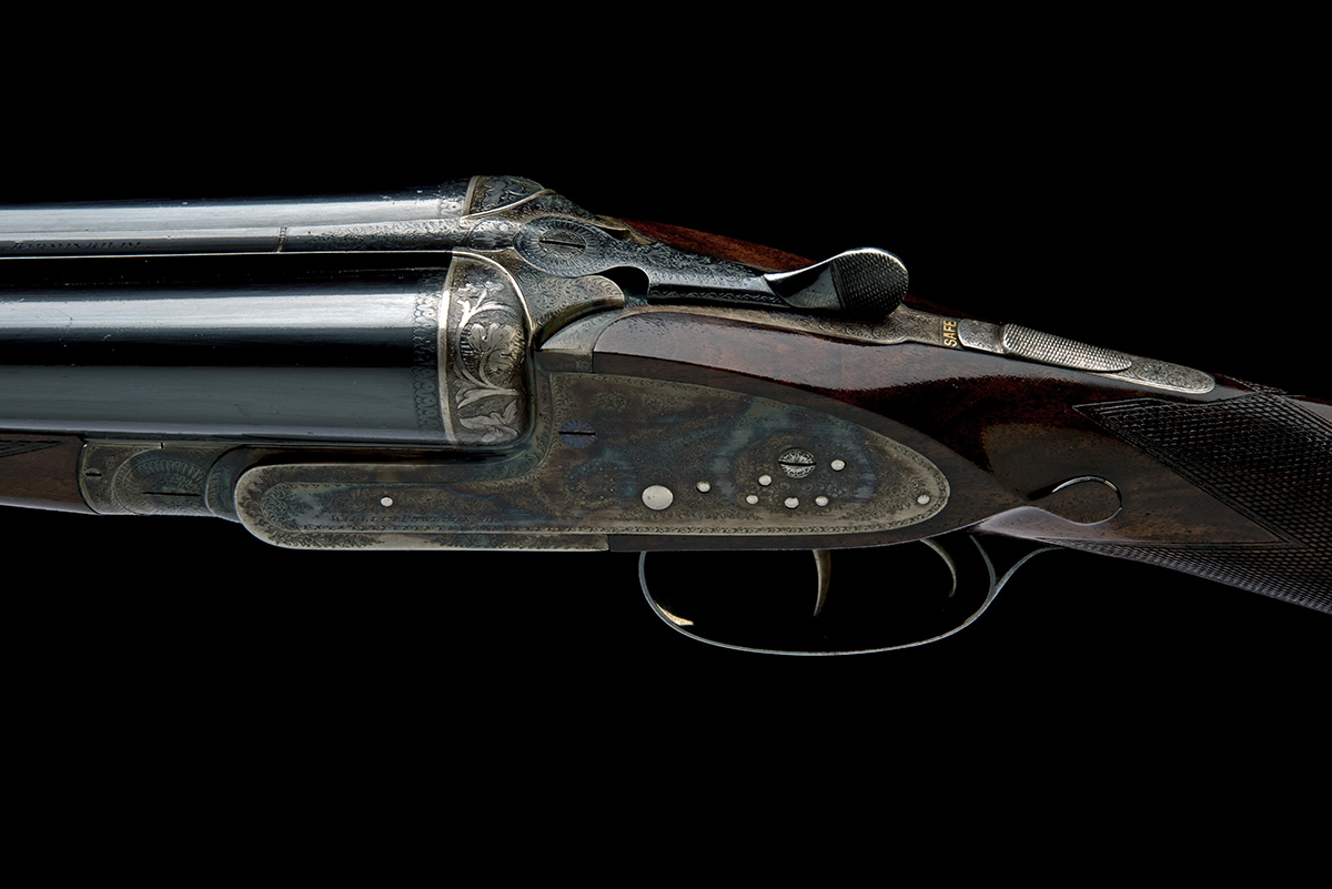 circa 1947, 28in. nitro barrels, the rib engraved 'WILLIAM POWELL & SON. 35, CARR'S LANE. BIRMINGHAM.', 3in. chambers, bored approx. full choke in both, treble-grip action, carved toplever, automatic safety with gold-inlaid 'SAFE' detail, fine acanthus scroll engraving with floral bouquets, the fences carved in relief with leaf designs on a matted background, retaining much original colour-hardening and finish, 14 1/8in. stock, weight 7lb. 9oz., in a suede covered case