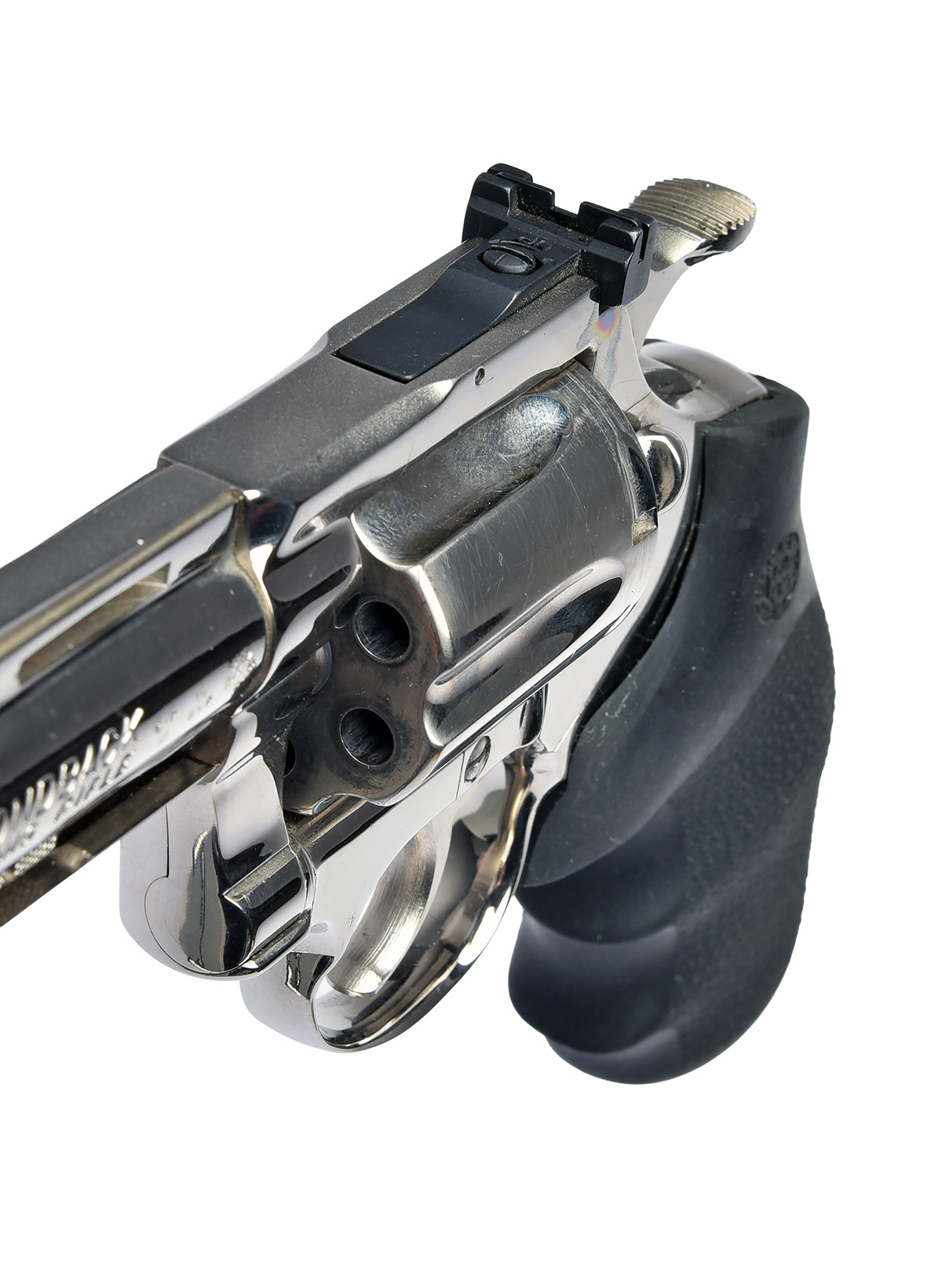 for 1984, with 4in. barrel marked with the model details and calibre to the left and the maker's signature to the right, ventilated rib, ramp fore-sight, adjustable rear-sight, solid frame, fluted swing-out cylinder, double action mechanism and fitted with a Hogue soft rubber finger-grooved grip, all finish intact