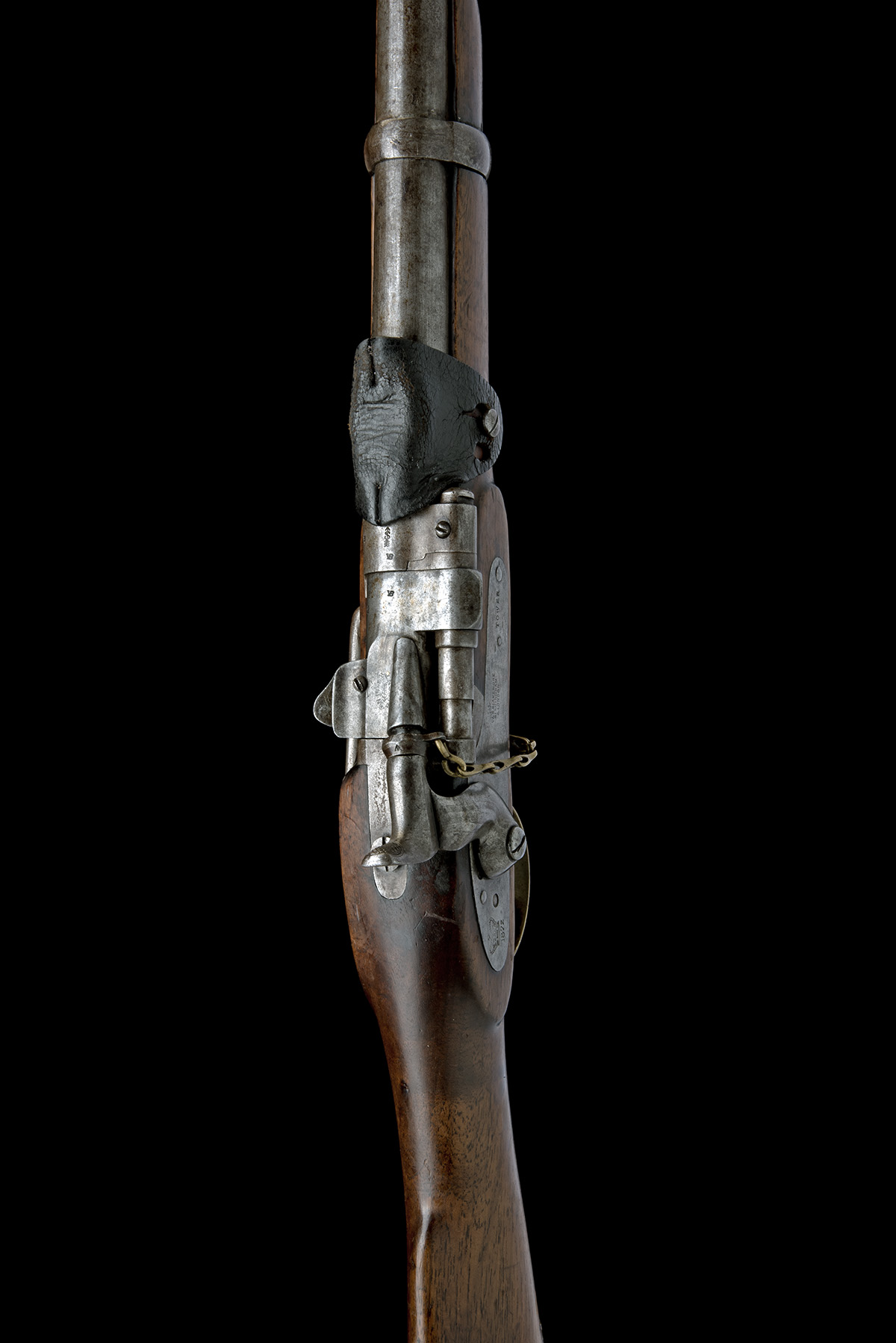 being a later South African registration number, commercial production dated for 1872, with five-groove 19 3/8in. barrel, block and blade fore-sight, carbine length ladder rear-sight, Birmingham proofs, flip-open breech with sprung thumb-catch and marked 'SNIDER'S PATENT' together with 'VB' marks, plain lock, the bar signed 'V.R. BLAKEMORE' over 'BIRMINGHAM & LONDON', all behind 'TOWER', the tail with dated crown stamp, walnut half-stock with brass furniture, the heel-plate with central trap, iron saddle-bar to left side and retaining a chained pin-guard and its original leather rear-sight protector