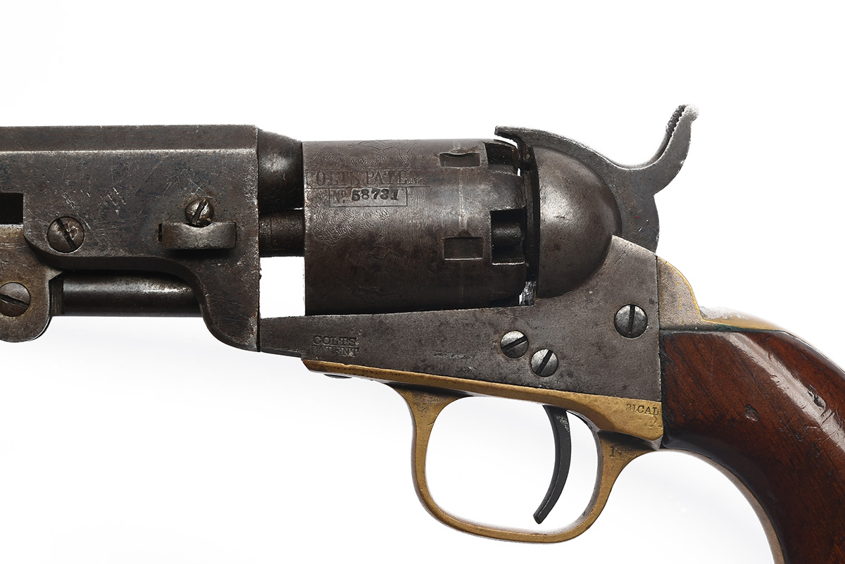 for 1864, with blued octagonal 6in. barrel signed on the top-flat 'ADDRESS COL. SAML. COLT, NEW-YORK U.S. AMERICA', open iron frame signed 'COLT'S PATENT' on the left, roll engraved stagecoach scene five-shot cylinder, brass grip-straps and trigger guard with traces of silver plating, smooth walnut grip (chip to right toe) and under-barrel rammer with traces of colour, all matching numbers including wedge, in its English market oak casing with brass screws to lid, the interior lined and compartmented in green baize, original instruction label within lid and containing a Dixon flask, Colt iron double-cavity mould and period tin of Joyce caps (lid bow-tie and lock escutcheons absent)