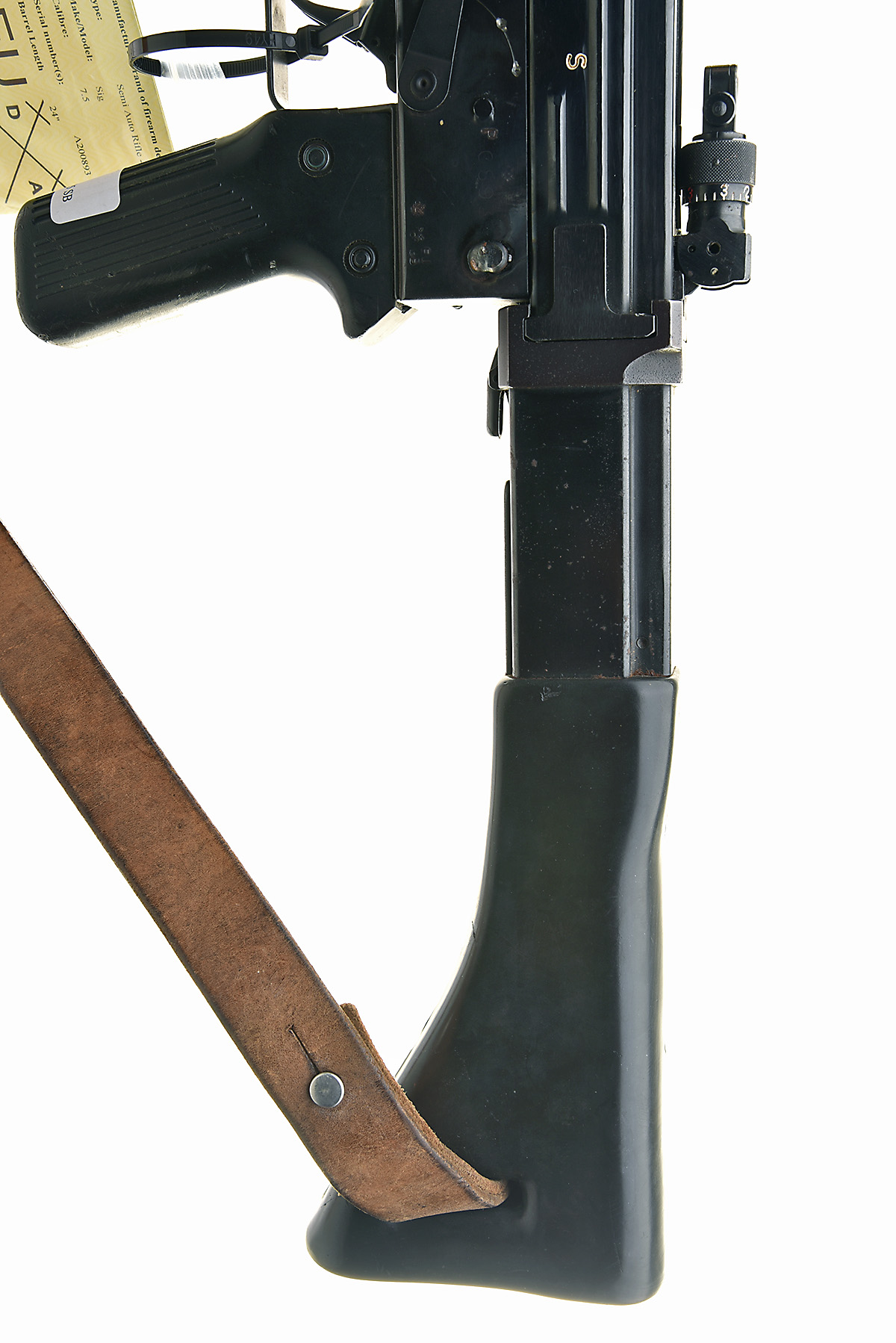 A DEACTIVATED WAFFENFABRIK BERN 7.5mm (SWISS) 'MODEL SIG STGW 57' SEMI-AUTOMATIC ASSAULT-RIFLE, serial no. A200893, circa 1975, 26 1/2in. barrel including flash-hider, folding tunnel-fore-sight, folding adjustable diopter rear-sight, iron ventilated hand-guard, pressed-metal receiver and frame, three-position selector, black rubber-coated butt-stock, black plastic pistol-grip, detachable box magazine, black plastic fore-grip and integral folding bi-pod, fitted with a Swiss military leather sling, together with its 2025 EU deactivation certificate