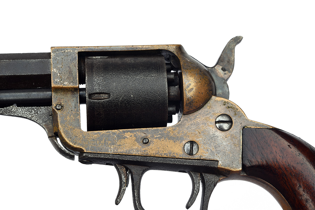 manufactured between 1852-4, with octagonal 5in. barrel signed on the top-flat 'E. WHITNEY N. HAVEN CT.', bead fore-sight, no provision for rear-sight, solid brass frame with traces of silver plated finish, iron five-shot cylinder with front locking notches, iron trigger guard bow with additional auxiliary trigger mounted forwards of the front of guard to release the cylinder for indexing, central hammer (repaired), smooth flared walnut grips (chipping to heel and lower edges), exposed iron surfaces fine pitted and frosted