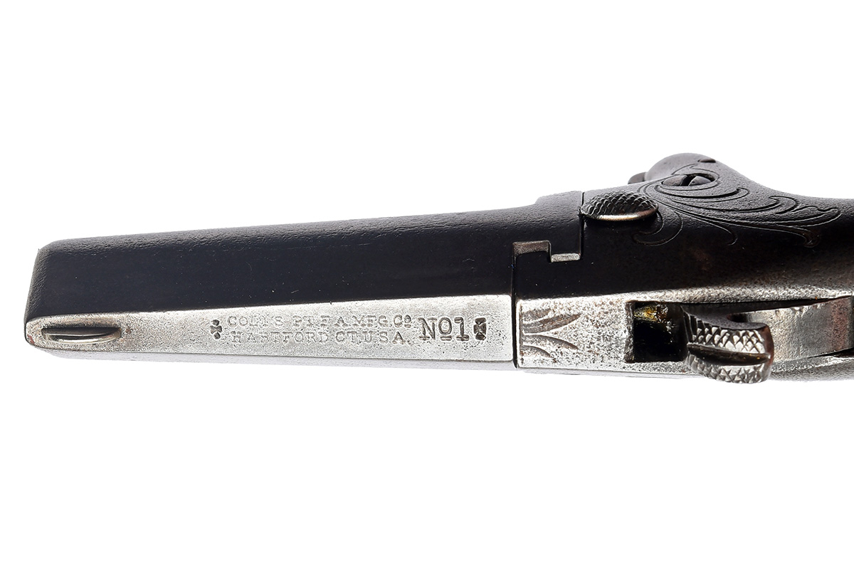 circa 1880, with 2 1/4in. rotate to load tapering ovoid barrel, flat sighting plane with crescent fore-sight and signed 'COLTS PT. FA. MFG. CO. HARTFORD CT. USA' and 'No.1', open scroll engraved brushed bright iron frame with integral grip with small oval chequered panels, exposed hammer with sighting notch and spur trigger, exposed surfaces shallow frosted, missing ejector plate