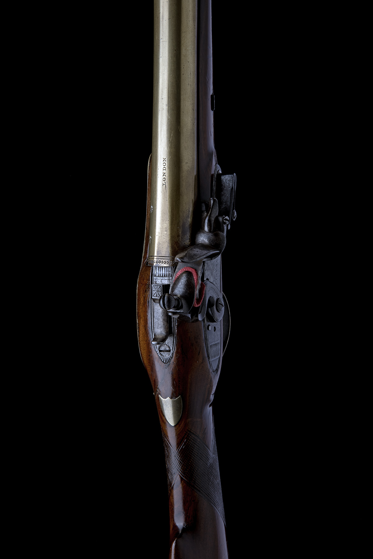 circa 1800, with round 11 3/4in. barrel with flared offset muzzle, the top at breech marked 'LONDON', top-mounted iron bayonet of concave sided triangular form released via a catch on the top-tang, borderline engraved semi bevel-edged lock with stepped tail and signed 'PINKNEY & SON' below the pan, swan necked cock, walnut full-stock chequered at the wrist, cracked through the wood centrally and with period working repair including full brass sideplate, shotgun butt, brass furniture and replacement brass-tipped ramrod