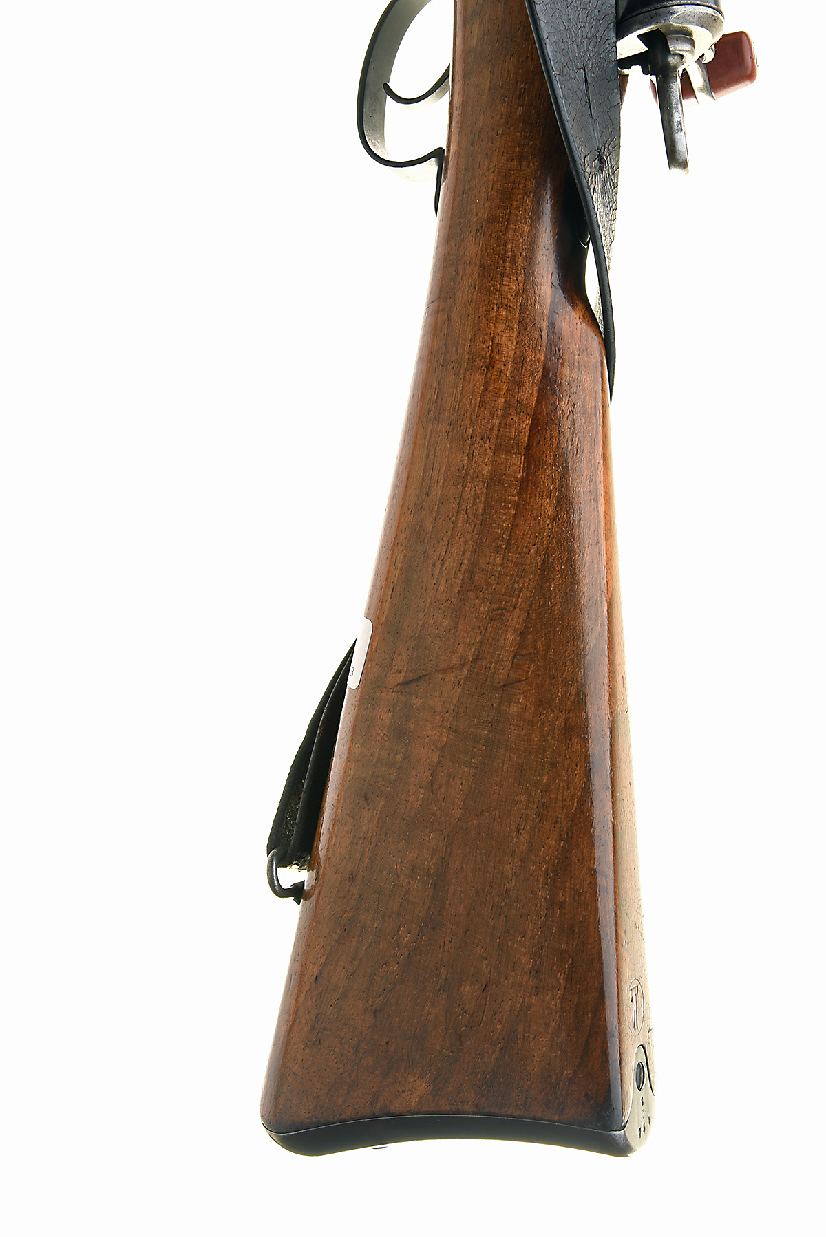 A 7.5x53.5mm (SWISS) SCHMIDT RUBIN M1889 STRAIGHT-PULL SERVICE-RIFLE, serial no. 42734 circa 1898, with 30 3/4in. barrel, blade fore-sight, elevating tangent fore-sight, fluted receiver with hard-rubber handled straight-pull bolt, walnut full-stock, box magazine, swivels for a sling and bayonet lug and stacking spike at muzzle, all matching numbers, strong amount of finish, complete with issue sling and muzzle protector