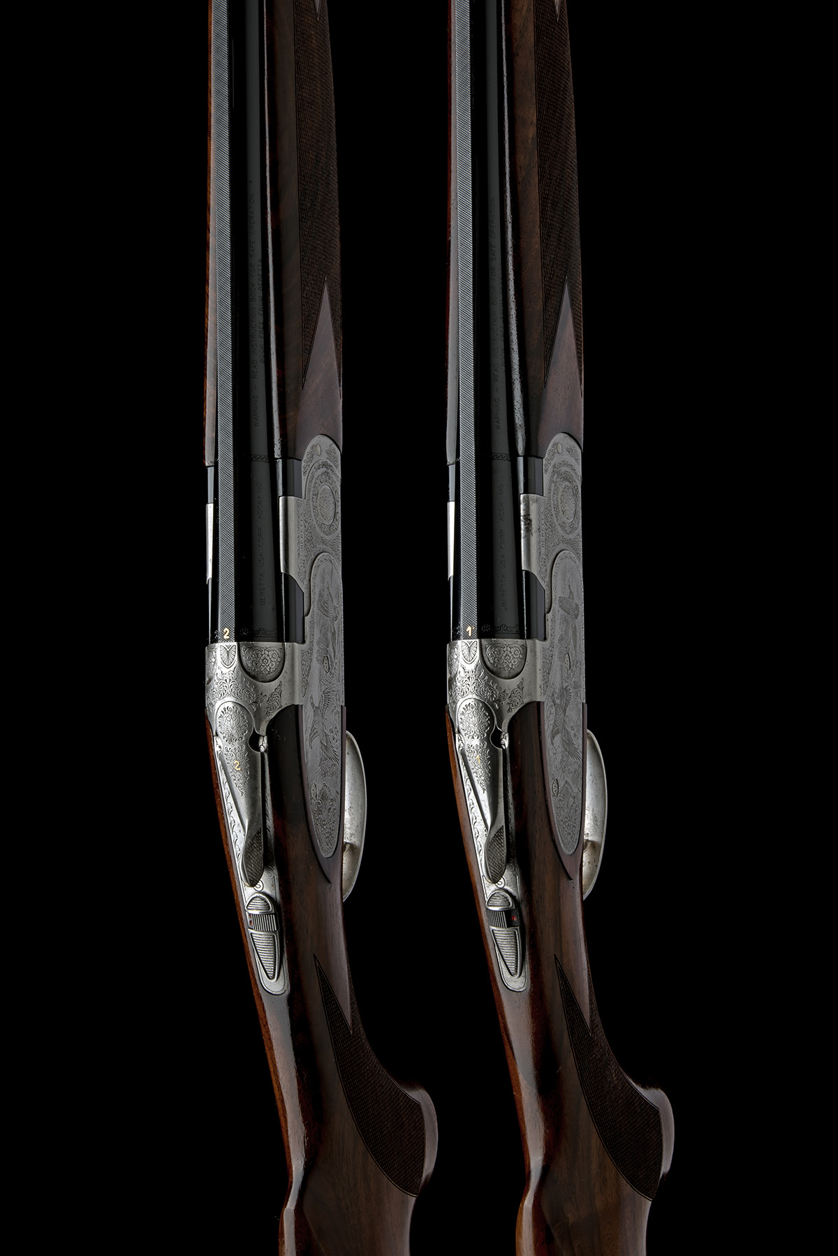 for 2008, 29 1/2in. high performance steel proof nitro 20-bore barrels with 6mm ventilated matt top-ribs, gold-inlaid '1' (R19952S) and '1*' (R15593S) at the breech ends, 3in. chambers, multichokes (with spares), the fore-end release catches gold-inlaid '1' (R19952S) and '1*' (R15593S); with additional 28in. nitro 28-bore barrels with 6mm ventilated matt top-ribs, gold-inlaid at the breech ends '2' (R19952S with barrel number R51528B) and '2*' (R19953S with barrel number R51527B), 2 3/4in. chambers, multichokes (with spares), the fore-end release catches gold-inlaid '2' (R19952S) and '2*' (R19953S), hold-open toplevers gold-inlaid '1' and '2', automatic safeties with integral barrel selector switches, gold-washed single triggers, floral and acanthus scroll engraving, the decorative sideplates with game scenes of pheasant and woodcock, the undersides with the model designation and a further lone woodcock, 14 1/2in. pistolgrip stocks including 3/8in. recoil pads, weight 6lb. 7oz. (20-bore barrels) and 6lb. 10oz. (28-bore barrels) gun No. R51527S and 6lb. 8oz. (20-bore barrels) and 6lb. 9oz. (28-bore barrels) gun No. R19953S, each gun in its individual universal case with provision for both sets of barrels