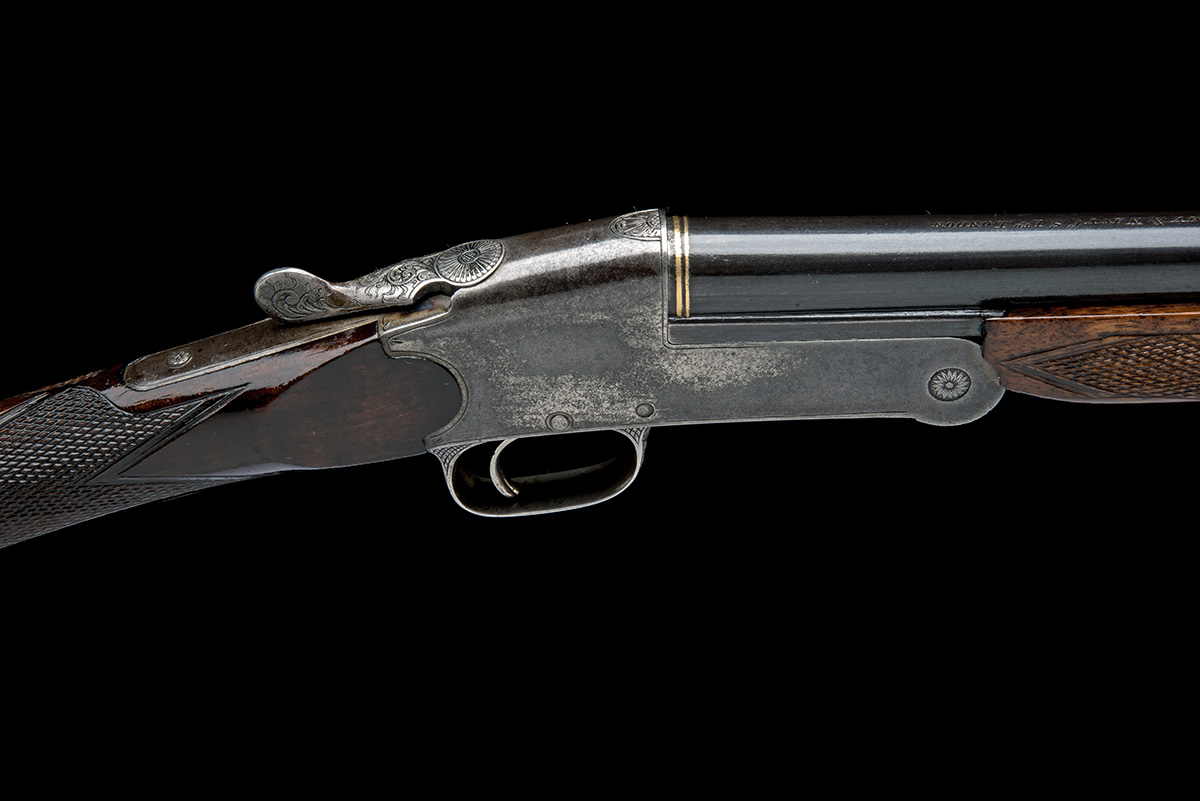 for 1927, 26 1/2in. nitro barrel, engraved 'ARMY & NAVY C.S. LTD. LONDON.', the breech end with two gold-inlaid bands, 2 1/2in. chamber, bored approx. true cyl., hammerless action incorporating patent no. 2323777 of 1924, automatic side safety with gold-inlaid 'SAFE' detail, the toplever and triggerguard engraved with acanthus scrollwork, the triggerguard also with gold-inlaid serial number, patinated finish, 13 7/8in. figured stock including steel buttplate, weight 3lb. 10oz.