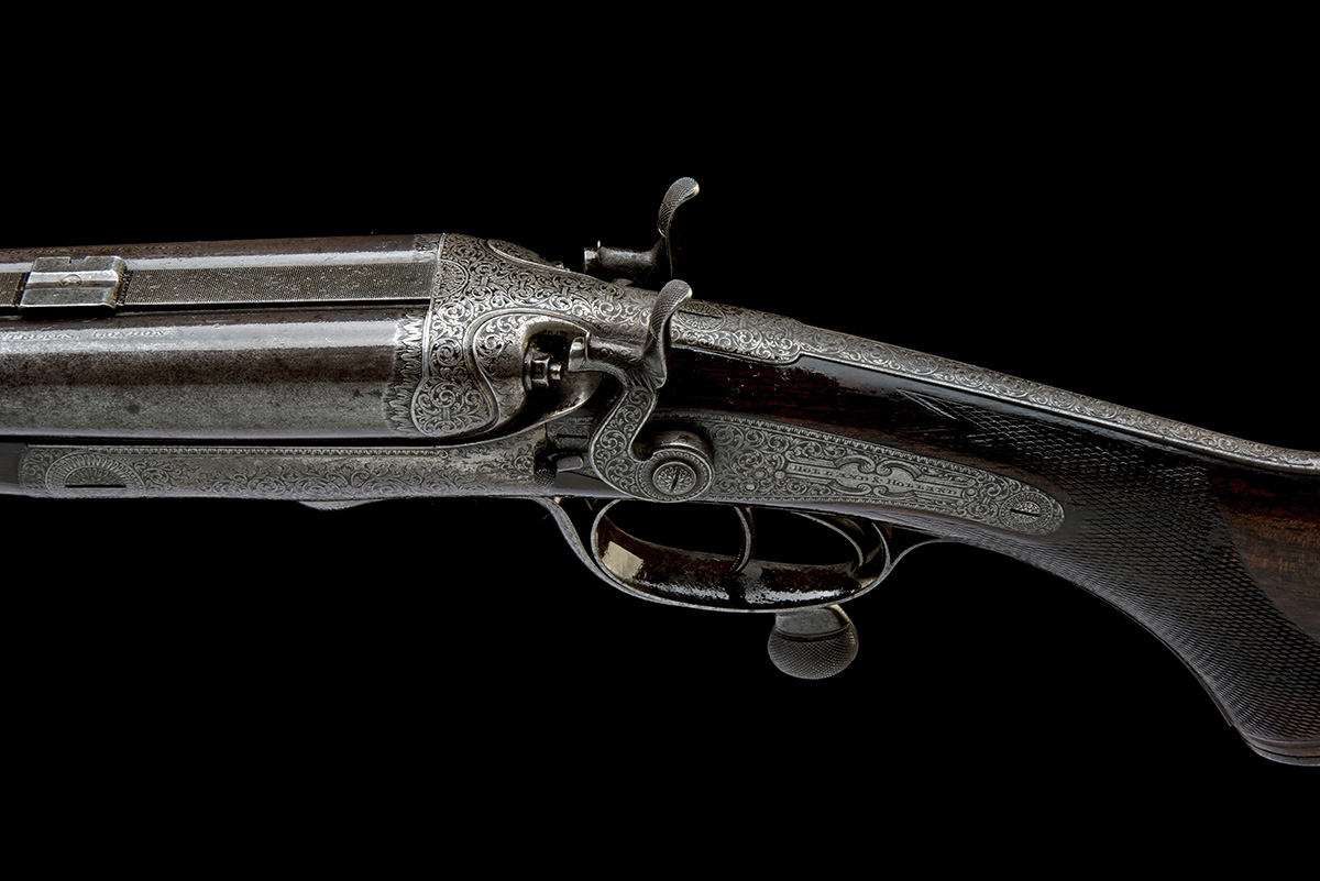 circa 1895, 28in. barrels proofed '.303 39 GRS RIFLEITE', matted sight rib with open sights with bone inserts and two folding leaf-sights, marked 200 and 300, telescopic sight mounts bases, ramp-mounted bead fore-sight, the tubes engraved 'HOLLAND & HOLLAND. 98. NEW BOND STREET. LONDON. WINNERS OF ALL THE "FIELD" RIFLE TRIALS. LONDON.', elongated action bar with Jones patent rotary underlever, carved percussion fences and side-clips, elongated top strap, rebounding back-action locks with bolted dolphin hammers, bold border and acanthus scroll engraving, the lockplates with 'HOLLAND & HOLLAND' in ornate cartouches, 14 1/2in. figured pistolgrip stock with cheekpiece, sling swivels and horn buttplate, engraved steel pistolgrip-cap, small gap from triggerguard tang to pistolgrip-cap (likely missing decorative insert), fore-end with Anson push rod release, weight