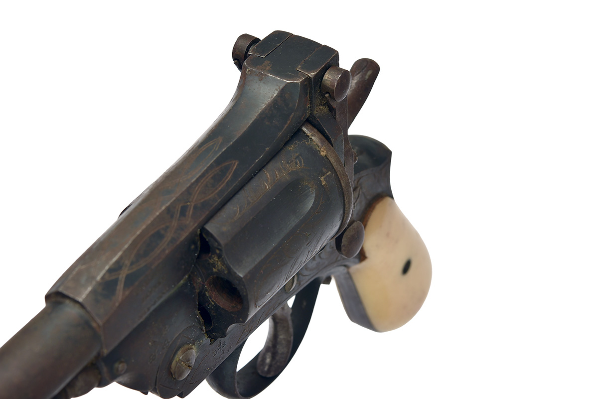 circa 1875, with round 3 3/4in. barrel, pinched blade fore-sight, no provision for rear-sight, break-open frame locked by twin 'Pryse'-bars and signed on the barrel-throat 'DASSEN PATENT' over 'GUSS-STAHL', a crown above 'G.M.' and a crossed keys device above hinge, the front left of frame body with 'L.G.' bisected by a stylised Liege pillar mark above 'SCHUTZ MARK', crude floral engraving repeated above each chamber on the elongated five-shot cylinder, full ring type ejector, double action mechanism and smooth bag-shaped bone grips, traces of finish