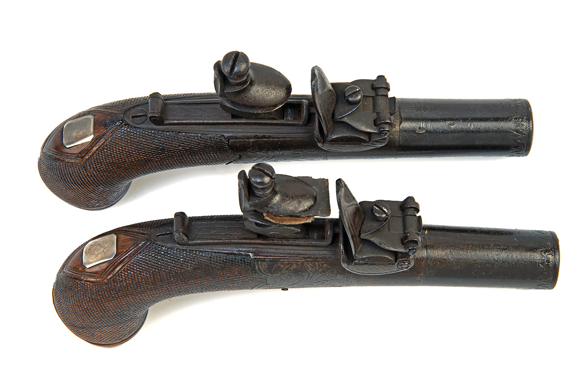 A PAIR OF 40-BORE FLINTLOCK POCKET PISTOLS SIGNED LACY & CO., no visible serial numbers,