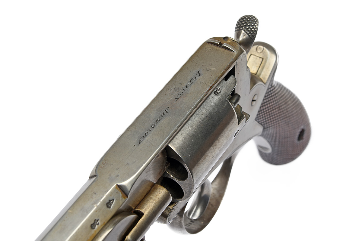 circa 1860, with octagonal 5 3/4in. barrel and London proof marks, articulated loading lever mounted on the left side of barrel, solid frame engraved on top strap 'LONDON ARMOURY' and to the right lower 'B7773 ADAMS PATENT No. 23425R' and with 'WD' with broad-arrow below the safety catch, five-shot cylinder stamped with London proof marks and engraved '23425R', double action mechanism with guarded trigger and spurred hammer, chequered one-piece walnut grip drilled to accommodate a lanyard, cleaned of finish overall