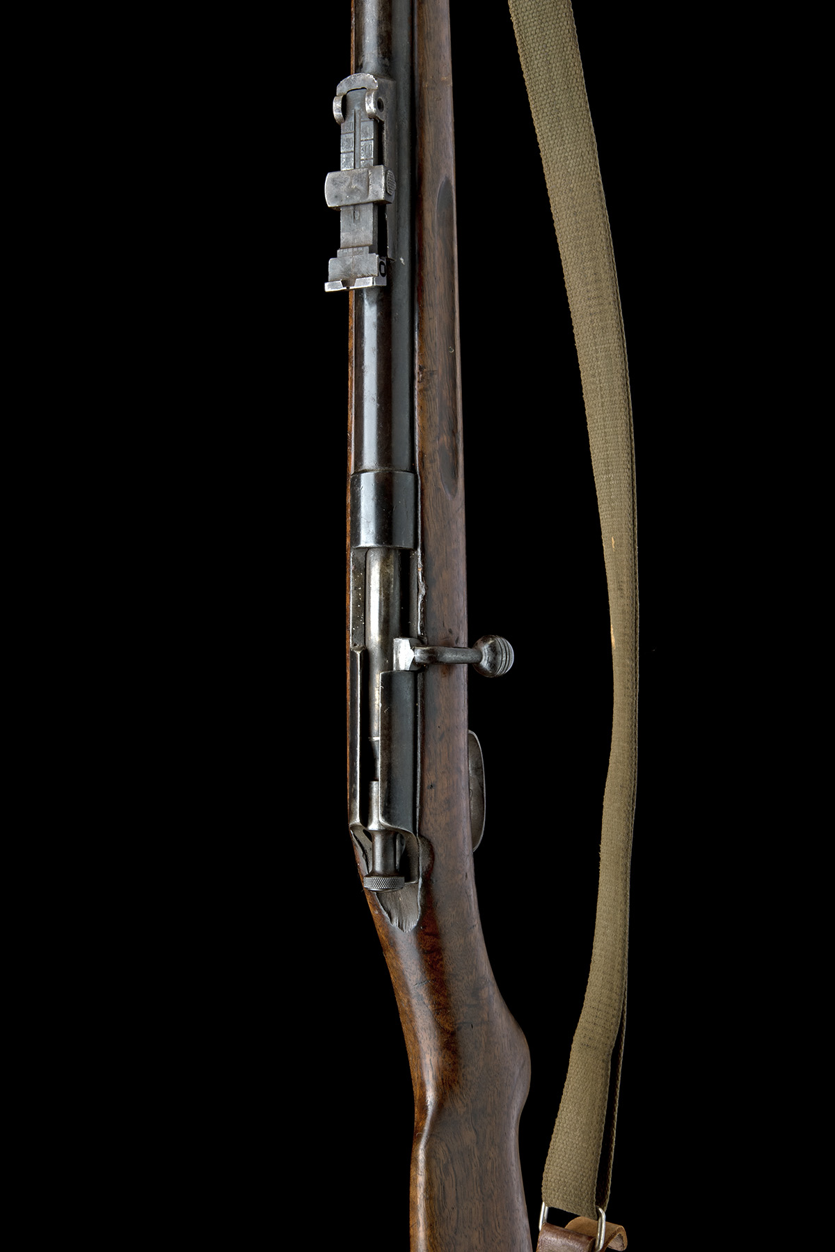circa 1925, German and probably by 'J.G.A.', with round 27 1/2in. barrel, ramp fore-sight, Mauser-style elevating rear-sight, rounded receiver with simple turn-bolt and sliding extractor, walnut half-stock (chipped at head behind receiver) with raised tear-drop cheek-piece, semi pistol-grip and blind finger-grooved fore-end, iron furniture including plain heel-plate and swivels, fitted with a later canvas sling