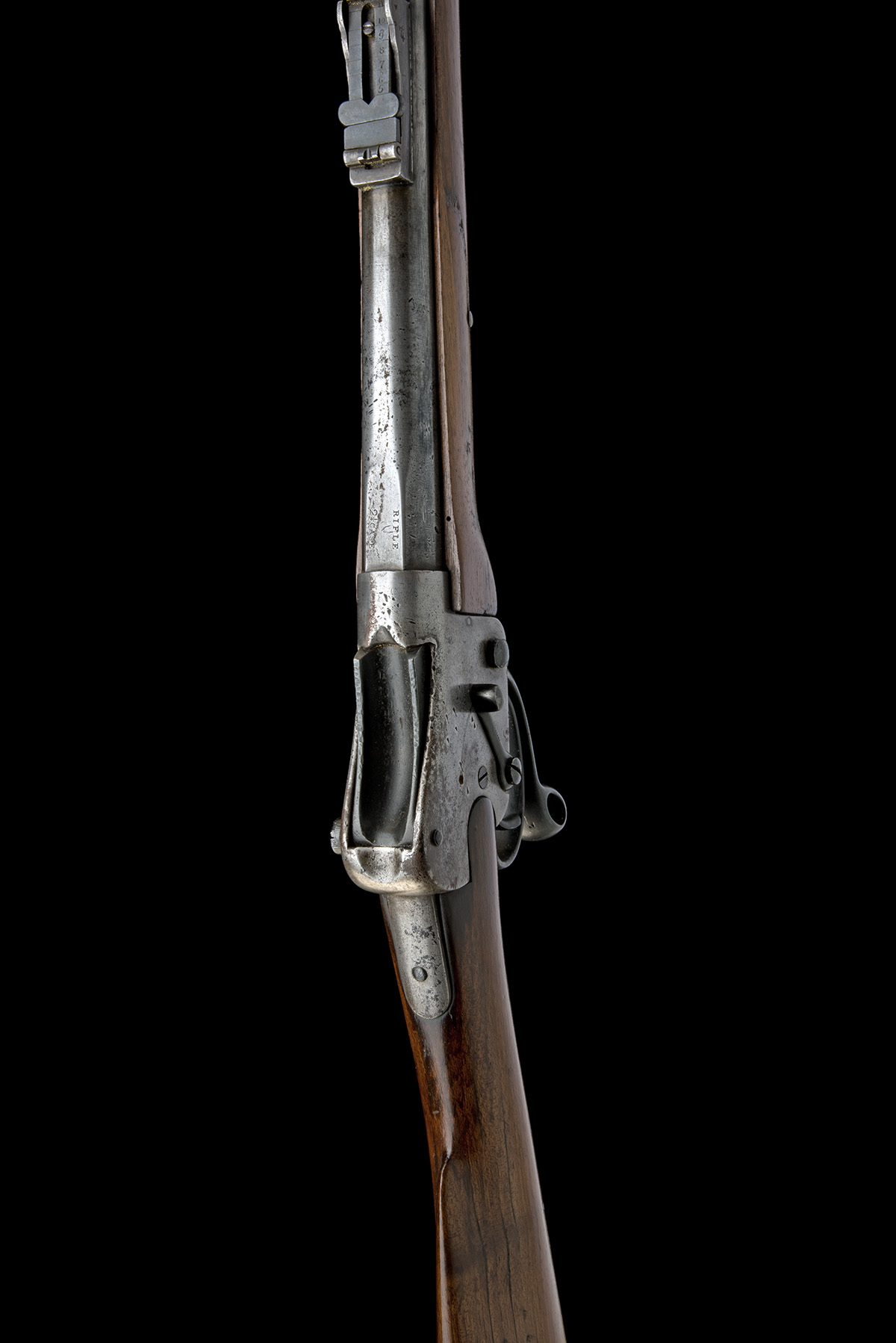 circa 1870 with 31in. Birmingham proofed barrel, the nocksform stamped 'RIFLE 2 1/4 case', block and blade front-sight and military pattern ladder rearsight (probably a working replacement), the action body marked on the left 'WESTLEY RICHARDS PATENT, 170 NEW BOND ST. LONDON', with forward hinged under-lever action, iron mounted two piece walnut stock, the fore-end secured by one pin and a replacement barrel band, missing clearing rod, finish worn, wood-work heavily refinished with inlet repairs to fore-end