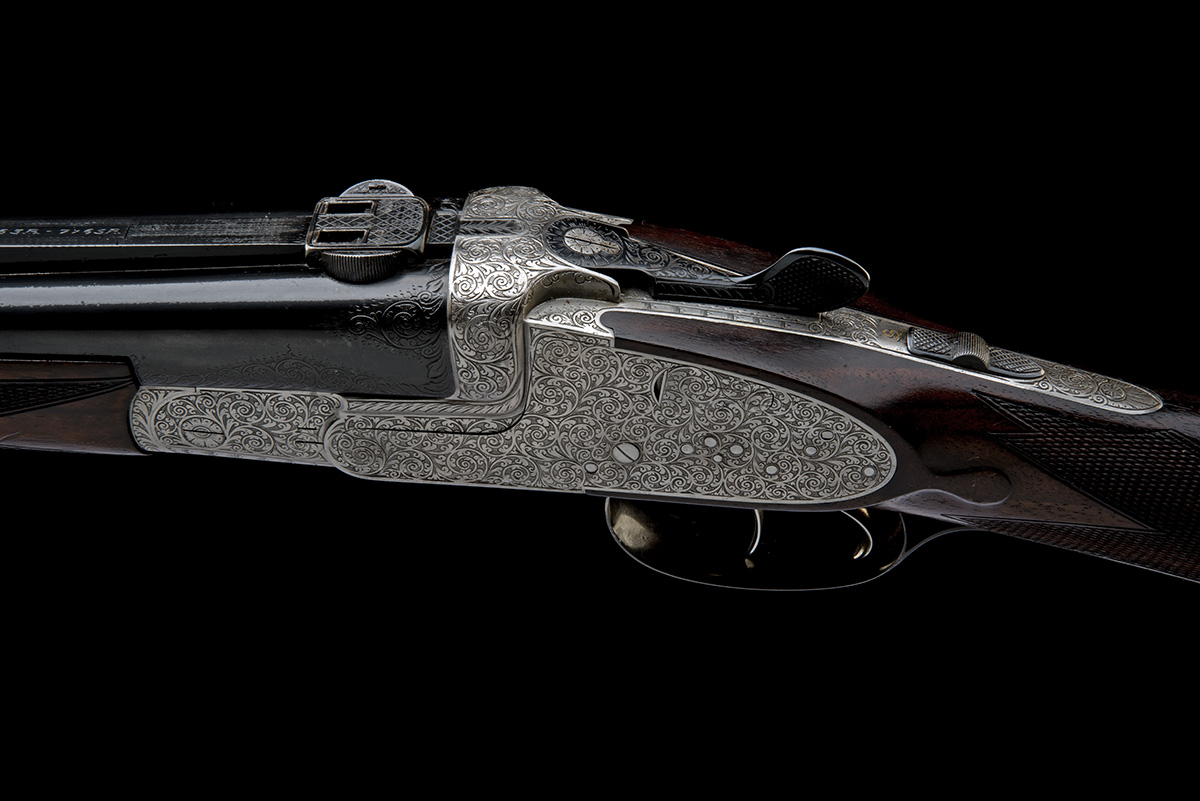 for 1972, 25 5/8in. nitro reproved Bohler Antinit-steel nitro chopperlump barrels (in 2003), matt sight rib with open sights and banner engraved 'KAL. 7X65R - 7X65R' with quickly-detachable telescopic sight mount bases, the rib engraved ' - JOSEF WINKLER. FERLACH - AUSTRIA -', ramp-mounted bead fore-sight, treble-grip action with short side-bolsters, removable striker discs, manual safety, hand-detachable lockplates with concealed flush release lever, cocking-indicators, articulated front trigger, fully engraved with bold Germanic scroll engraving, silver and blued finish, 14in. stock including 7/8in. recoil pad, 10 1/2in. fore-end with Deeley & Edge patent release and engine turned finish to the iron, weight 8lb. 14oz.