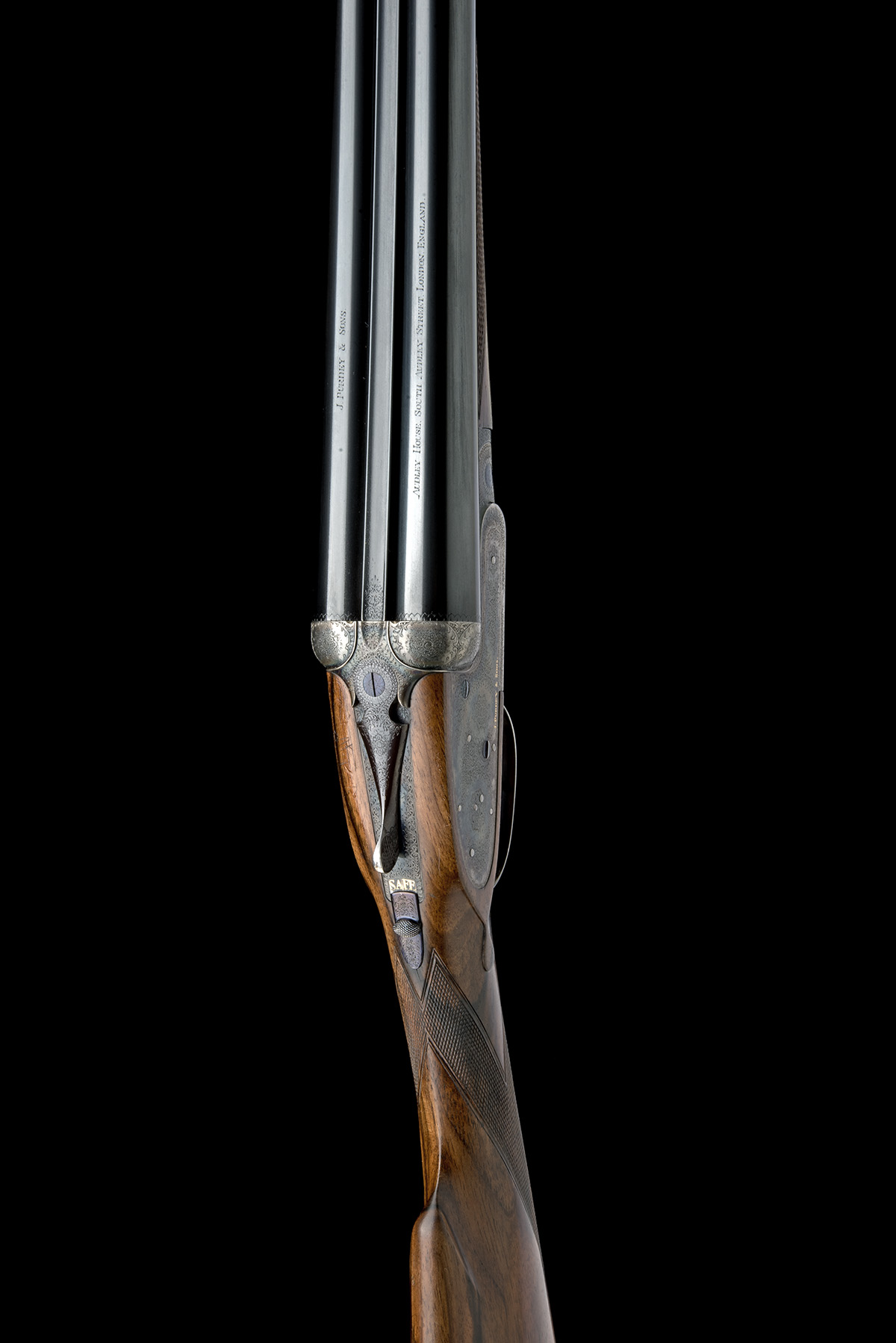 for 1988, 28in. nitro chopperlump barrels, the tubes engraved 'J. PURDEY & SONS AUDLEY HOUSE. SOUTH AUDLEY STREET. LONDON. ENGLAND.', 2 3/4in. chambers, bored approx. 1/4 and 1/2 choke, removable striker discs, automatic safety with gold-inlaid 'SAFE' detail, cocking-indicators, best fine acanthus scroll engraving with floral bouquets, retaining much original colour-hardening and finish, the lockplates gold-inlaid 'J. PURDEY & SONS.', the underside gold inlaid 'J. PURDEY & SONS. LONDON. ENGLAND.', the triggerguard tang gold-inlaid with the serial number, 15 3/8in. boldly-figured stock, the fore-end iron gold-inlaid with the serial number, weight 6lb. 7oz., in its lightweight leather case with canvas and leather outer cover and with an alloy flight case (will accommodate the cased gun)