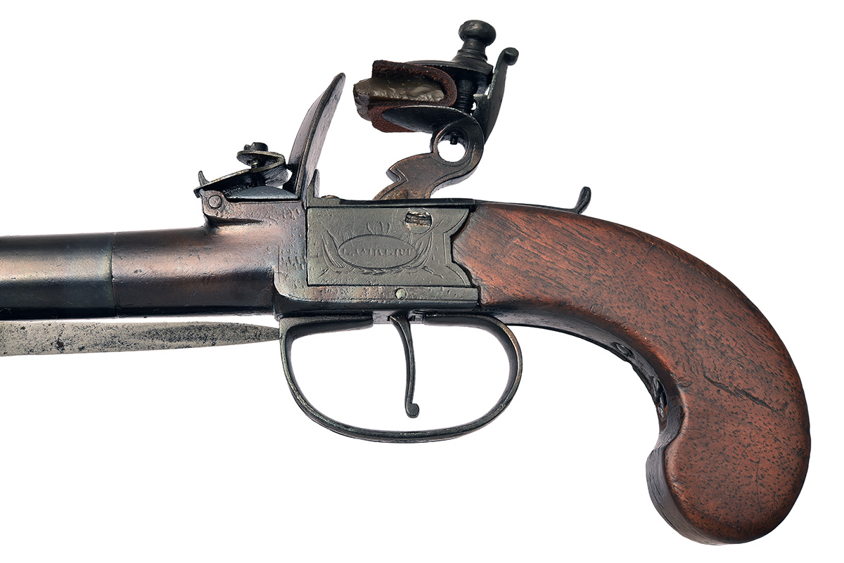 A 56-BORE FLINTLOCK BOXLOCK TRAVELLING PISTOL WITH FOLDING BAYONET, SIGNED LAMBERT, no visible serial number,