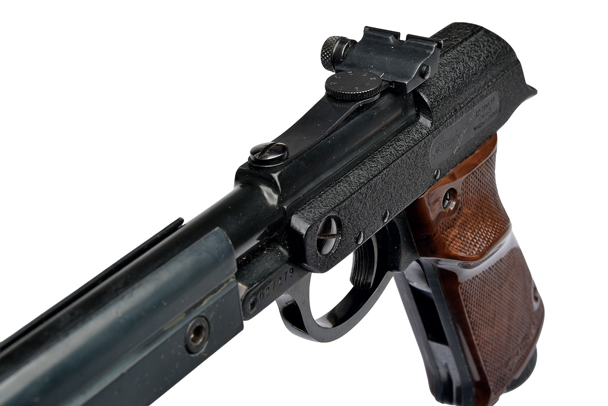 the pistol circa 1961, with blacked 9 1/2in. barrel, ramp fore-sight, micro adjustable rear-sight, black crackle-finished receiver with make and model details plus 'MADE IN GERMANY', mottled brown chequered plastic grips, collector's external condition and complete with wooden cocking aid and scarce additional barrel-weight, in a later wood case with cleaning rod, additional fore-sight blades and sundry tools