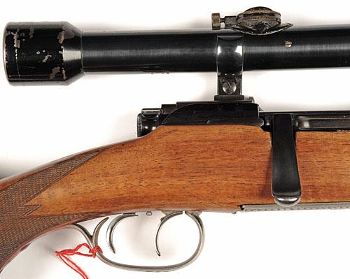 60cm. blued nitro barrel numbered '3', bead fore-sight, rear-sight of one standing and one folding leaves calibrated to 300 metres, blued receiver marked 'STEYR-DAIMLER-PUCH A.G., STEYR', fitted with a Zeiss 'Zielvier' telescopic sight engraved 'JOH. SPRINGER'S ERBEN WEIN' in quick detachable mounts, 14in. figured pistolgrip stock (toe of butt cracked), raised cheek-piece, chequered grip and fore-end, set triggers, bright trigger-guard and magazine floor-plate respectively machine engraved with a roe buck's head and a stag's head, brown woven leather sling.