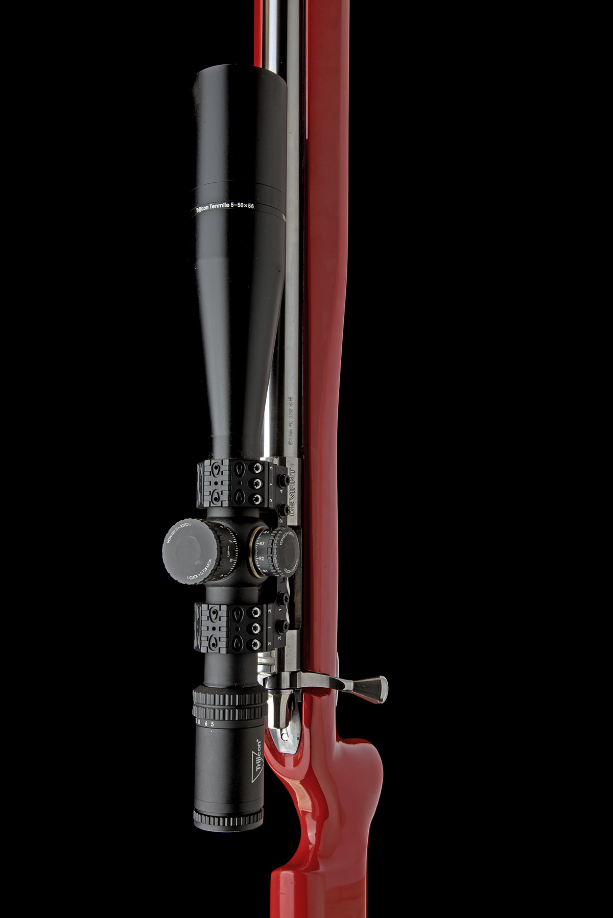 recent, built with a heavy round stainless-steel 31in. barrel London proved in 2023, faceted stainless-steel receiver with integral machined Picatinny rail, the left side of receiver signed 'DEFIANCE, COLUMBIA FALLS MT', spirally grooved bolt-body with stainless billet bolt-handle, no provision for safety-catch, fitted with a full chassis red enamelled three-quarter right hand F-Class Open stock and fitted with an 'R.A.D' recoil reducing pad, polished stainless guard and short accessory rail below the flat-based fore-end and mounted with a Trijicon 5-50x56 34mm tubed telescopic sight in a 'R.O.M.E'. dedicated one-piece mount with built-in folding spirit-level, the whole appearing very little used and including the box and papers for the sight