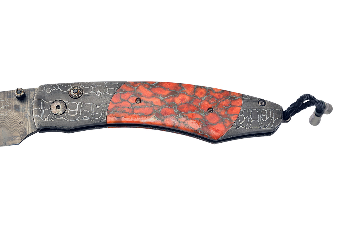 number '43' of a limited edition of '100', with tungsten-coated 'Black Wave' damascus 3in. drop-point blade manufactured with a core of 'ZDP-189' for extra strength and signed on the left side with the subtle 'WH' trademark in a circle surrounded by 'ZDP-189', 'HAC 67' and the serial number, engraved thumb-opening assist stud with spinel gem end-stone, the bolsters of special 'Croc-Skin' damascus by Chad Nichols and with engraved thumb-opening lock button further mounted with a spinel end-stone, the scales of 'zinc matrix' apple coral, turned pillar spacers between the bolsters, the heel fitted with an applied lanyard swivel mounted with a leather lanyard with turned stainless finials, unused in its makers presentation inner and outer boxes with certificate of authenticity dated May 26, 2016, a signed leather pouch with belt-clip and a memory stick containing highlights from the range of William Henry knives and jewellery