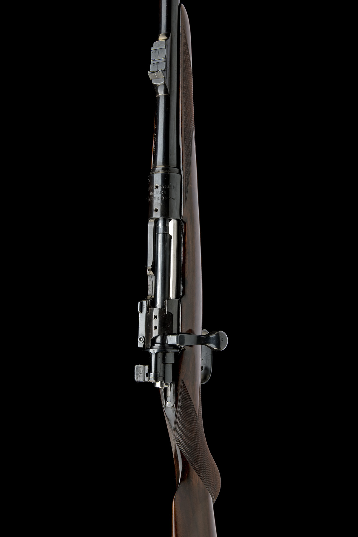 circa 1900, 23in. unsigned replacement barrel with block-mounted open sights, two folding leaf sights, white metal inlaid sight lines and marked for 100, 200 and 300 yards, ramp-mounted bead fore-sight, receiver (with thumb cutout) tapped for telescopic sight mount bases, the receiver ring engraved 'WAFFENFABRIK MAUSER OBERNDORF A/N 1899', detachable floorplate with military style release, the triggerguard serial numbered 1688 (in Rigby style) and also 'B3572' (in a similar style to G. Gibbs), semi-pistolgrip stock with sling eyes, 14in. pull, weight 6lb. 12oz., in a full length canvas case with F. Beesley trade label