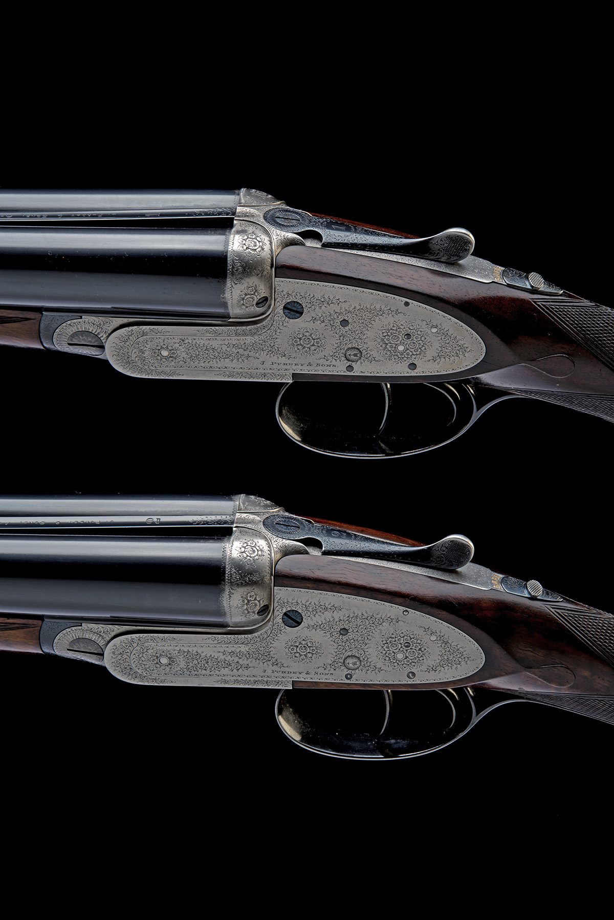 for 1899, 28in. replacement nitro chopperlump barrels (by the makers), ribs engraved 'J. PURDEY & SONS. AUDLEY HOUSE. SOUTH AUDLEY STREET. LONDON. ENGLAND' and '1' and '2' at the breech ends, 2 1/2in. chambers, bored approx. imp. cyl. and 1/2 choke, toplevers engraved '1' and '2', automatic safeties with gold-inlaid 'SAFE' details, arrow cocking-indicators, best fine acanthus scroll engraving with floral bouquets, brushed bright and reblued finish overall, 14 5/8in. well-figured stocks including 5/8in. leather covered recoil pads, weight 6lb. 9oz., in a brass-cornered leather case