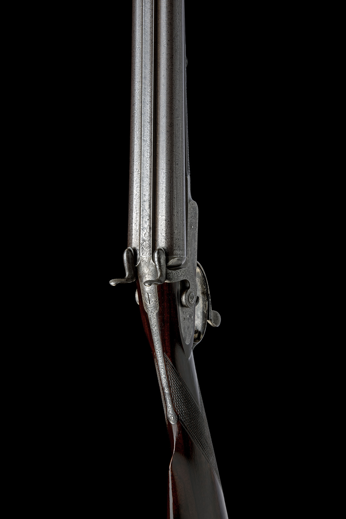 circa 1864, with 30in. damascus twist barrels, the top-rib signed 'BURNAND, PILGRIM ST, NEWCASTLE ON TYNE', border and scroll engraved long top-tang featuring a vignette of a gamebird, border, scroll and gamescene engraved bar action locks signed 'BURNAND' to both bars (traces of colour), en-suite dolphin headed hammers, fully engraved swing under-lever concealing further gamescene engraving to the trigger guard bow, chequered walnut butt-stock, the underside of stock with gold oval monogrammed escutcheon above the initials 'G.J.', iron heel-plate with engraved spur, chequered walnut splinter fore-end with cross-key fastener and iron fore-end tip