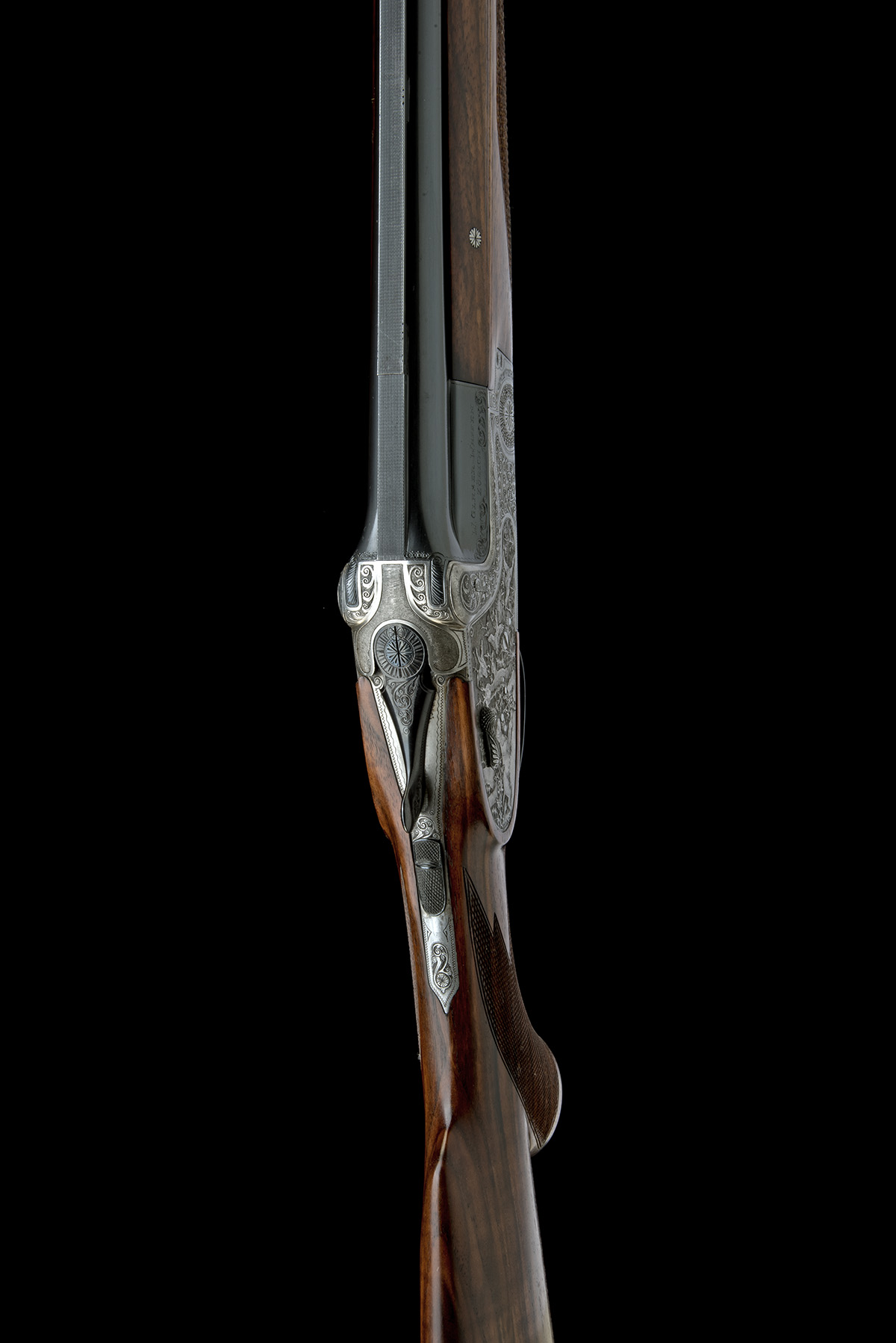 for 1959, 29in. nitro reproved barrels with tapered ventilated matt top-rib with intermediate bead sight (rib loose at breech join), 2 3/4in. chambers, Teague multichokes (with spares), the shoulders engraved 'GEBRUDER MERKEL. SUHL' and 'W. GLASER-WAFFEN ZURICH', three-piece fore-end, hold-open toplever, manual safety, hand-detachable lockplates, cocking-indicators, single trigger with triggerplate mounted barrel selector slide, bold border and Germanic scroll engraving, the lockplates finely carved in relief with game scenes of hound, fowl and fox in woodland settings, all on a finely matted background, 14 7/8in. figured pistolgrip stock with domed pistolgrip-cap and including 1/2in. recoil pad, weight 7lb. 8oz., in a faux-fur lined vinyl case