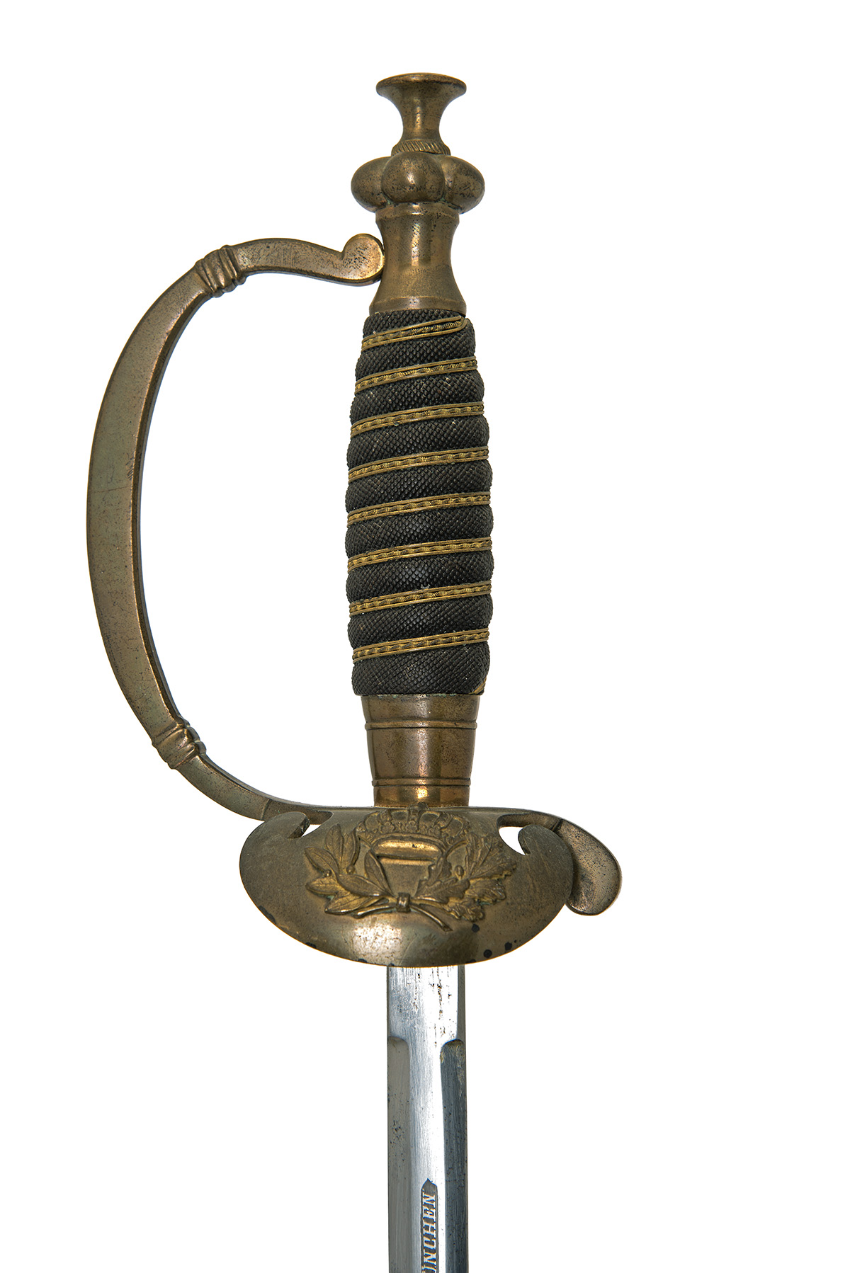 circa 1890, with 31in. double-edged blade etched both sides with a panel bearing the motto 'In Treue Fest', and on one side a further panel with the maker's details 'M. Zoltsch Munchen', ricasso with the Kirschbaum knight's head mark, brass hilt with shell guard carrying the Royal crown within a victory wreath, knuckle-guard, fishskin grip bound with brass twist-wire, together with its leather scabbard with brass fittings