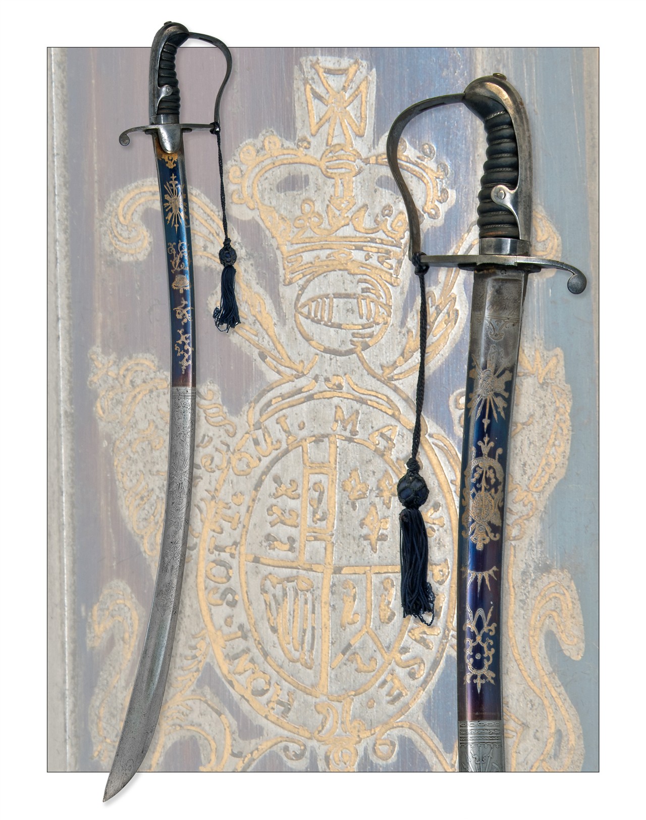 dates to 1800-1805, with 31in. curved single-edged blade, deep broad fullers, the tops etched on both sides, with the top half of the etching in blue and gilt, one side with two stands of arms, Royal coat-of-arms, Britannia and a mounted Hussar, the other with three stands of arms, Royal cypher, Britannia and an angel, the forte engraved 'H. Osborn / Bordesley / Birmingham' (Osborn worked from this address 1800-1805) plus a stamped 'G', hilt with stirrup guard and wire-bound leather grip, no scabbard, one langet absent, later sword-knot