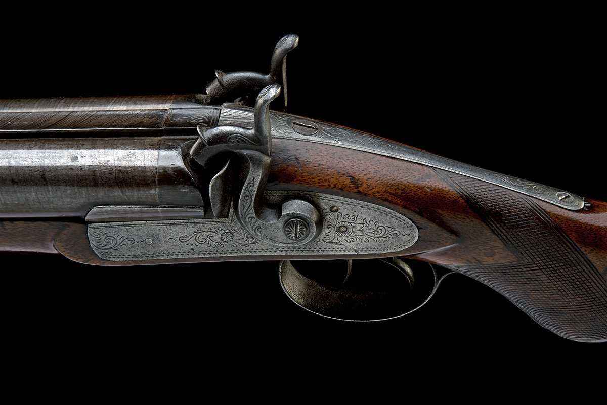 circa 1860, with heavy laminated 32 1/2in. browned barrels signed on the top-rib in a banner 'J. MANTON' (probably spurious), Birmingham proofs, borderline and scroll engraved top-tang, borderline and scroll engraved bar-action locks, walnut half-stock with chequered half pistol-grip, iron furniture and replacement ramrod
